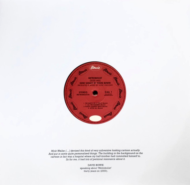 Comes in gatefold sleeve with white thick paper inner sleeve featuring a quote of David Bowie from the year 2000 commenting on the cover.