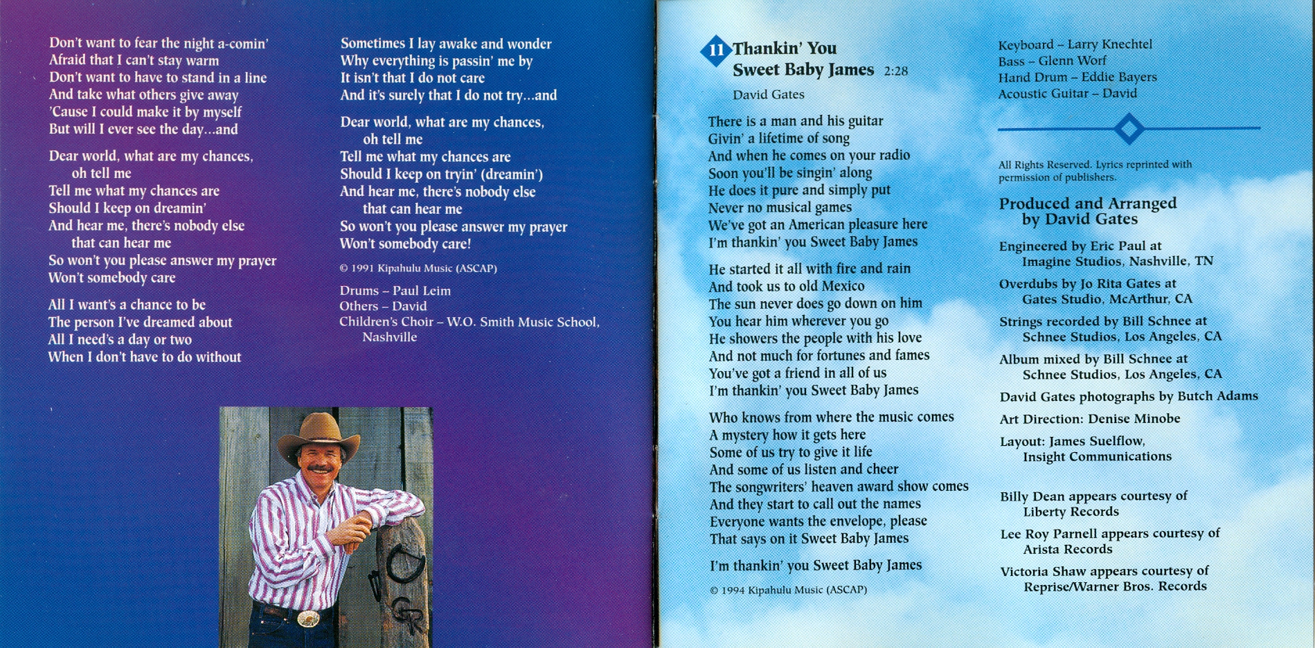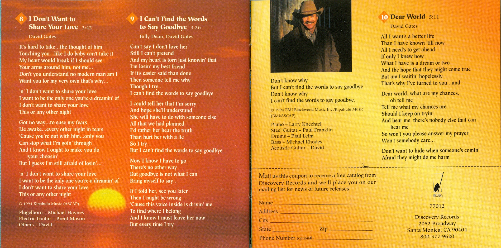 После распада Bread в 1973-м году (они распались на пике успеха, после двух мощных альбомов) David Gates продолжил записываться на том же лейбле Elektra. Конечно, его сольники не смогли конкурировать по популярности с работами группы, но, все же, его великолепную музыку можно назвать эталонной для поп-софт-рока 1970-х.