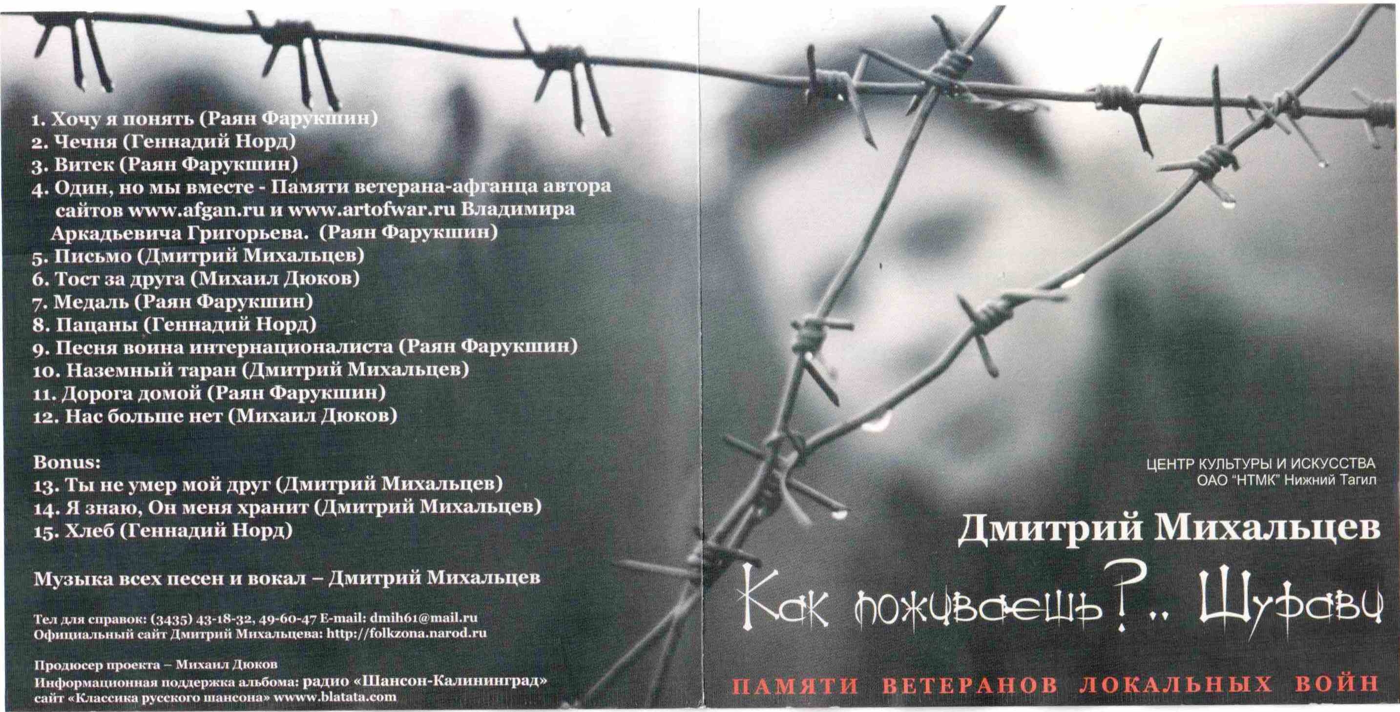 Это первый (и не последний) официальный диск Дмитрия Михальцева, до этого были, так скажем, пробы пера в жанре «шансона»: от классического старого блата до авторских вещей. Этот диск сложной судьбы – один раз он был утерян (капризы техники), да и посвящён он сложной теме – войне, если быть точнее, то посвящён он ветеранам всех локальных войн. В своём интервью в преддверии выхода диска автор сказал: «Колючая проволока – атрибут войны». Сам диск строг и аскетичен в звучании – гитара и обжигающий душу вокал, такие песни не поются на публику с надрывом, это своё, это личное. Это нужно понять и прочувствовать, разговор сорокалетнего мужчины о жизни, о том, что наболело, без спекуляций и излишнего пафоса.