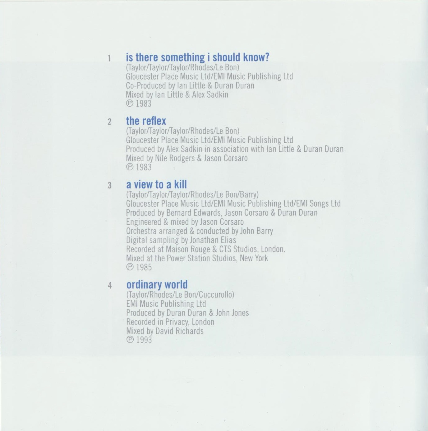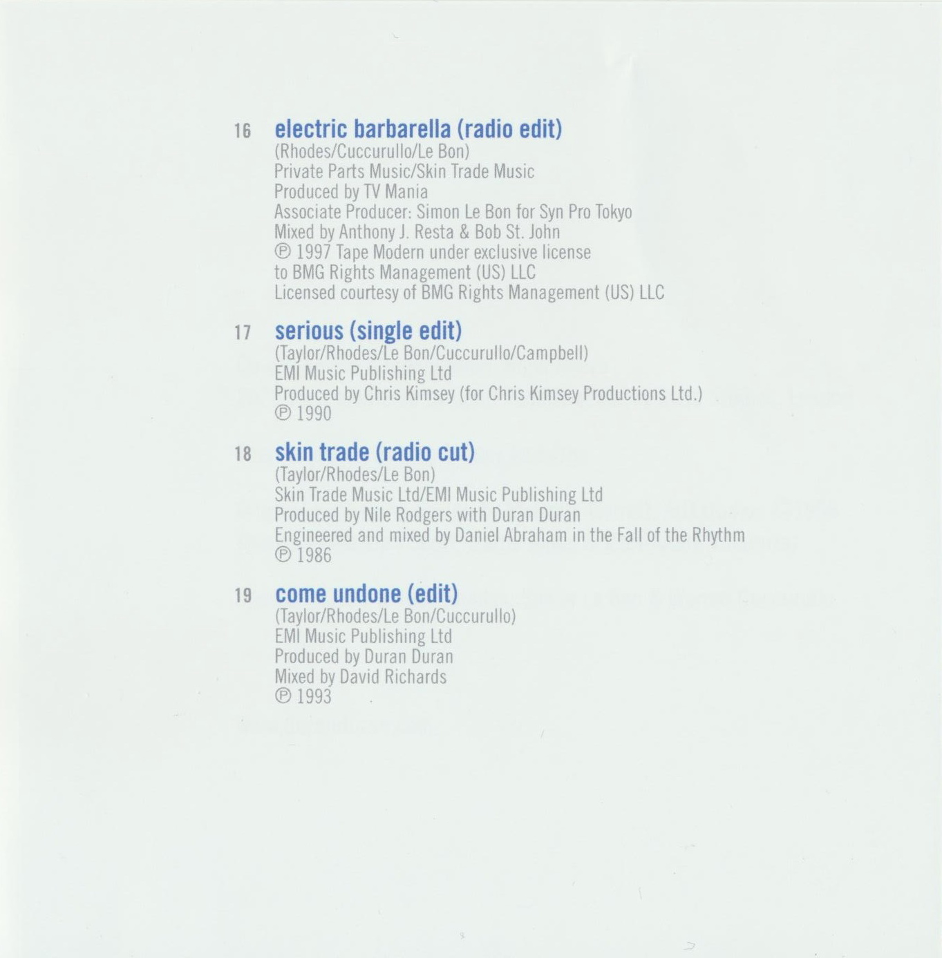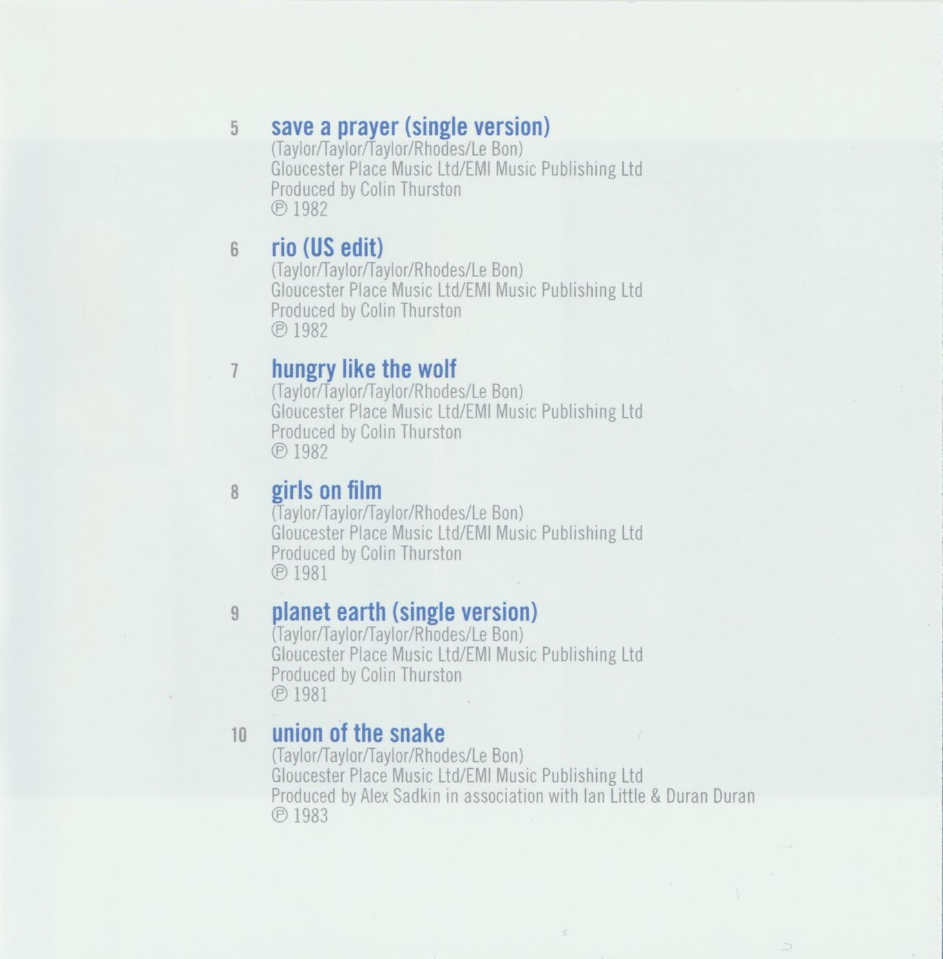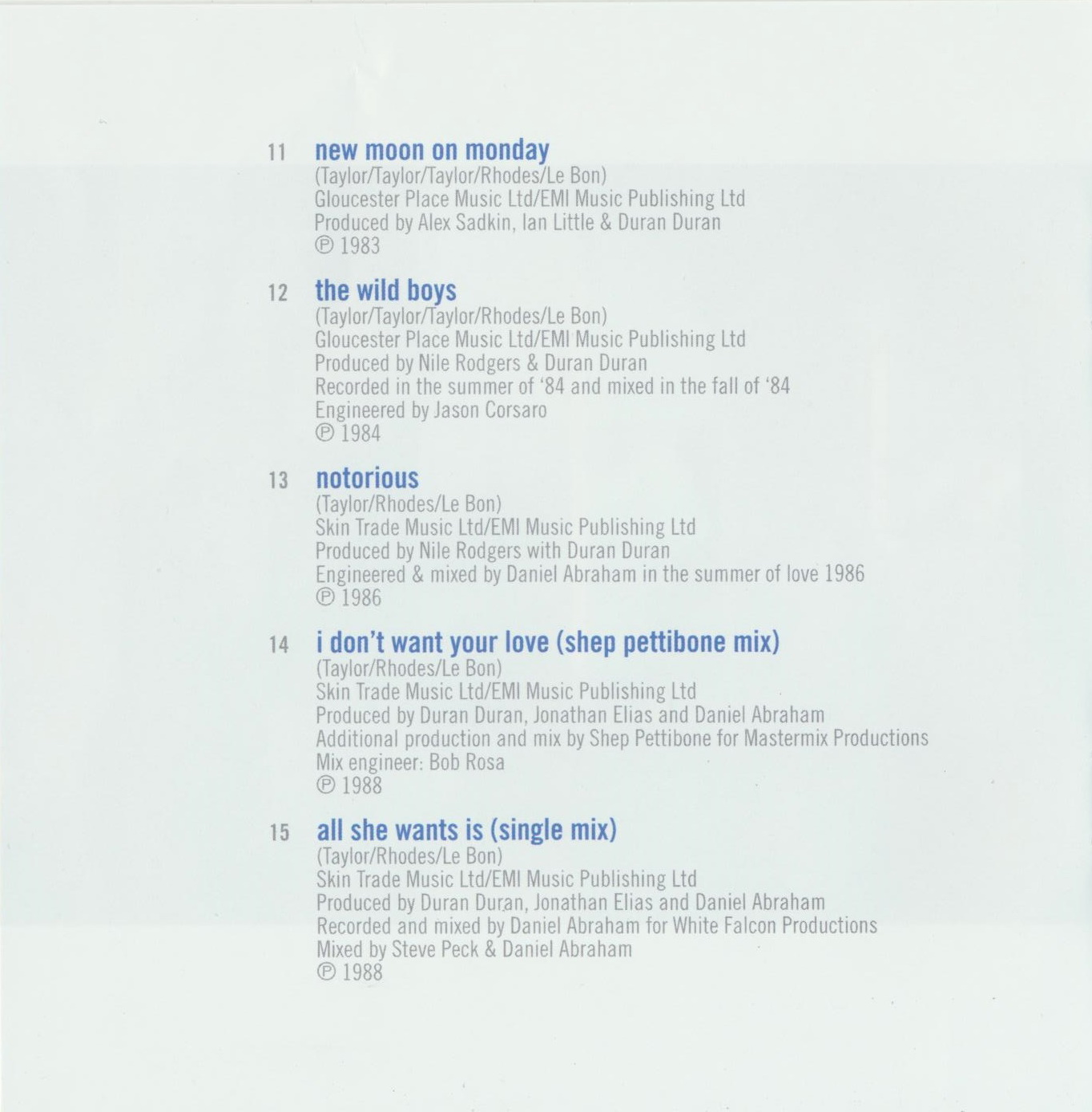 Simon Le Bon – lead vocals / Nick Rhodes – keyboards / John Taylor – bass (tracks 1–15, 17, 18) / Andy Taylor – guitars (tracks 1–3, 5–12) / Roger Taylor – drums (tracks 1–3, 5–12) / Warren Cuccurullo – guitars (tracks 4, 13–19), bass (16) / Sterling Campbell – drums (tracks 15, 17)