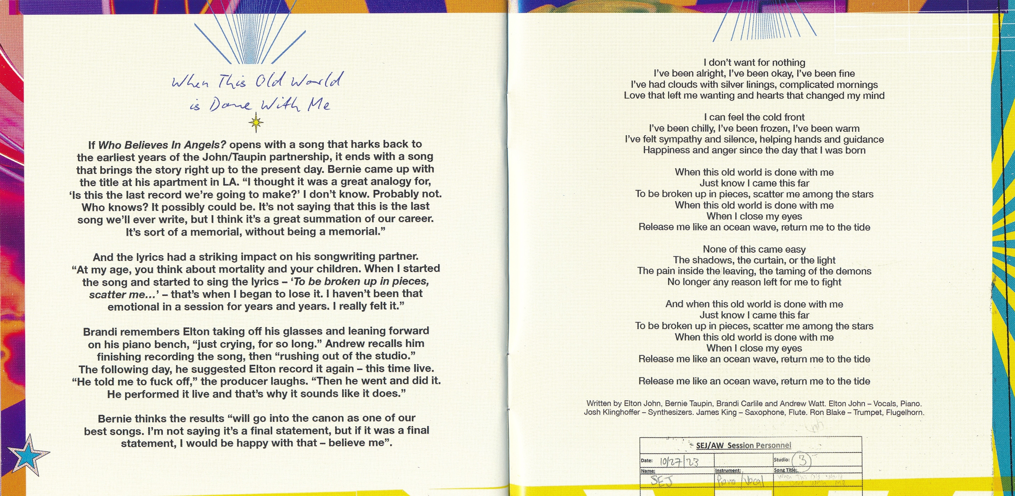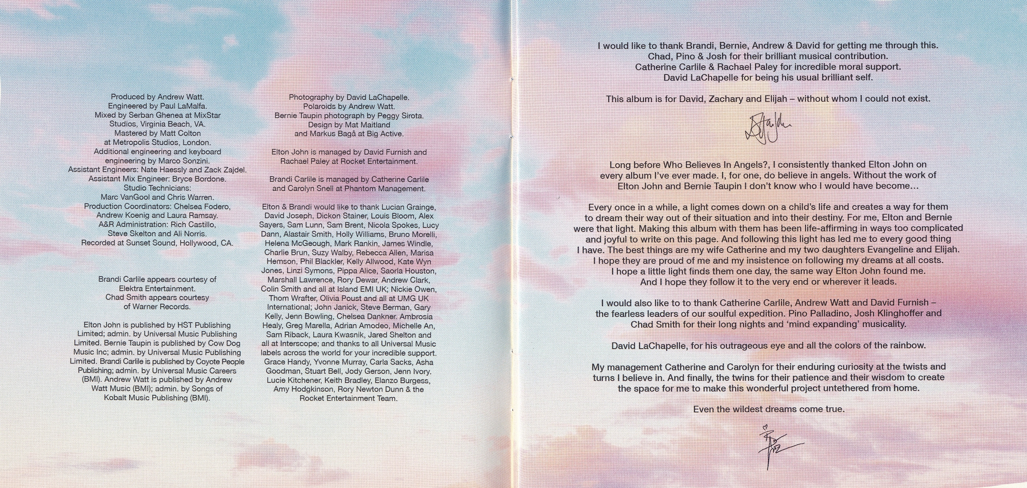Тексты песен написали давний соавтор Элтона - Берни Топин и Брэнди Карлайл. Элтон говорит: "Эта пластинка была одной из самых сложных, которые я когда-либо делал, но это также был один из величайших музыкальных опытов в моей жизни. Она дала мне место, где я знаю, что могу двигаться вперед. "Who Believes In Angels?" кажется переходом в другую эпоху, и я толкаю дверь, чтобы войти в будущее. У меня есть всё, что я сделал, позади, и это было блестяще, потрясающе. Но это новый старт для меня, это начало моей карьеры".