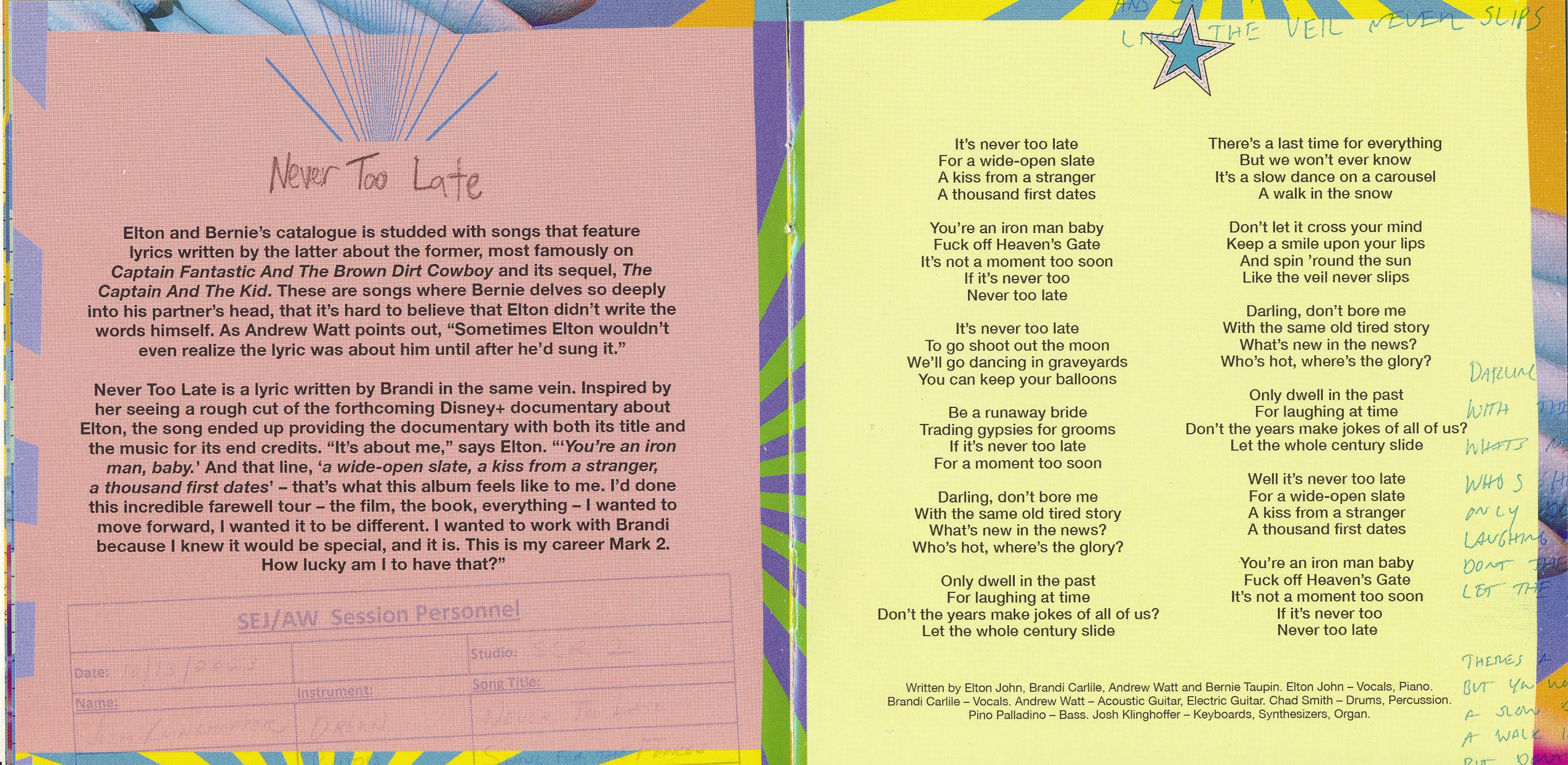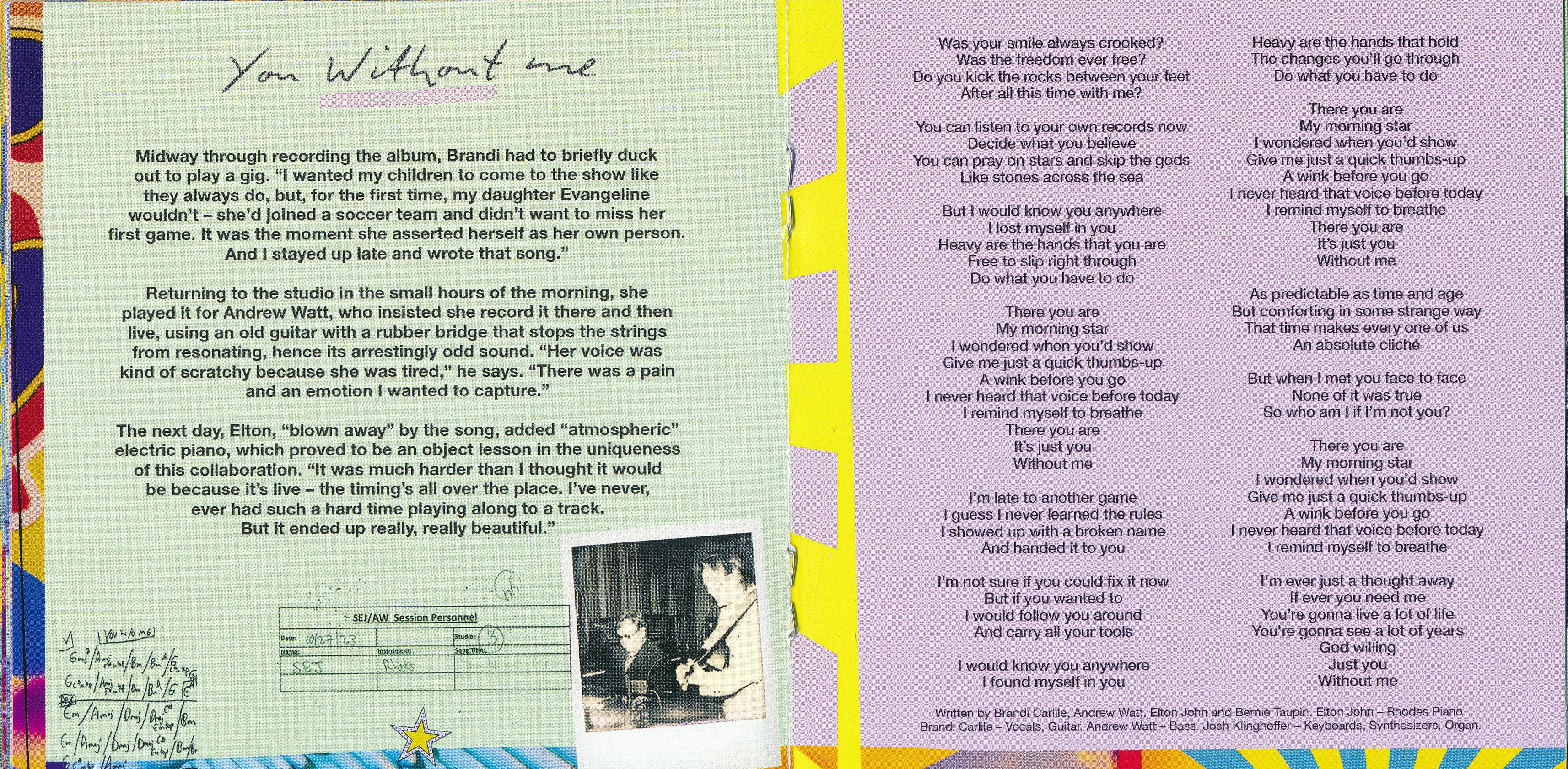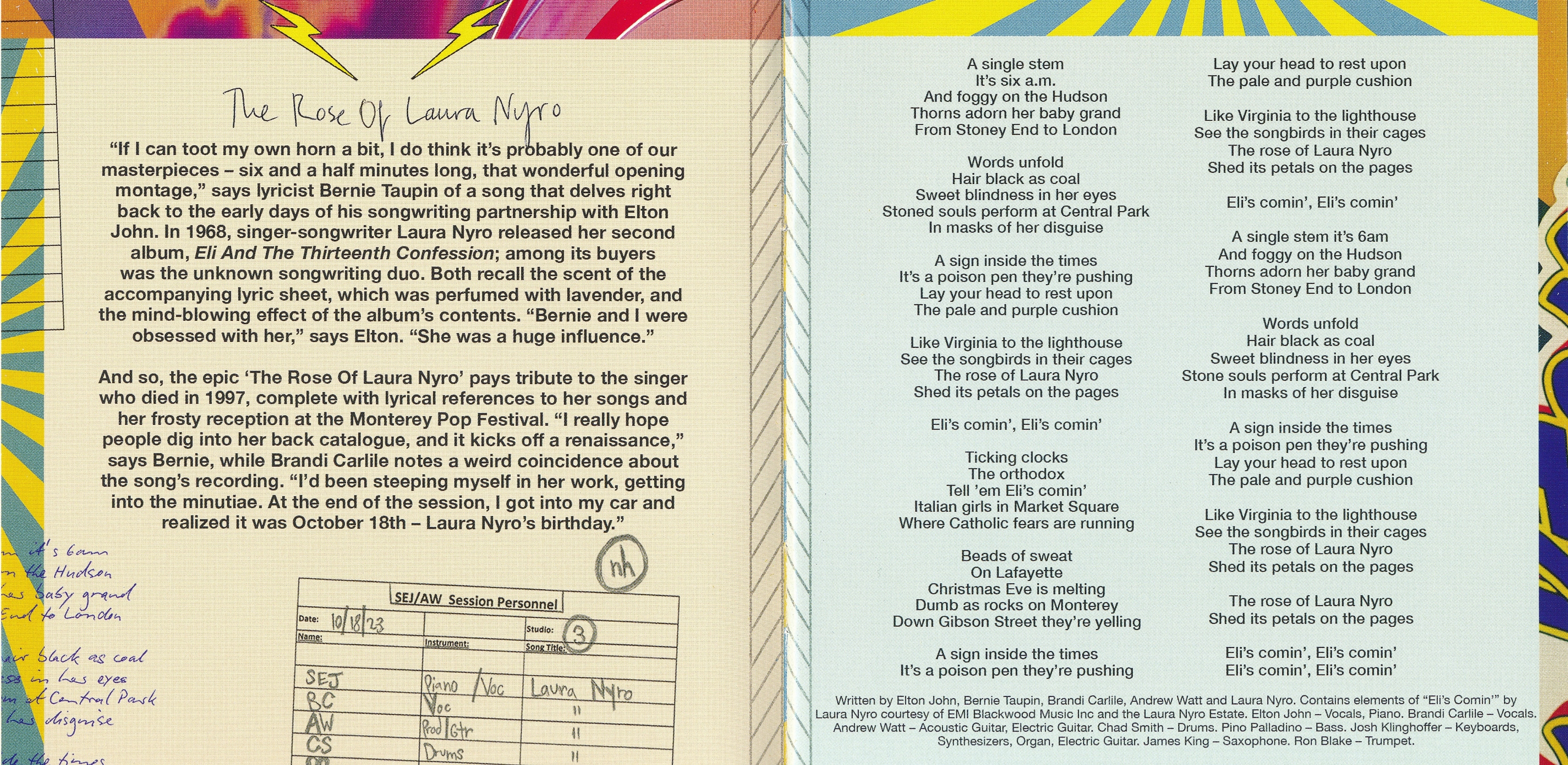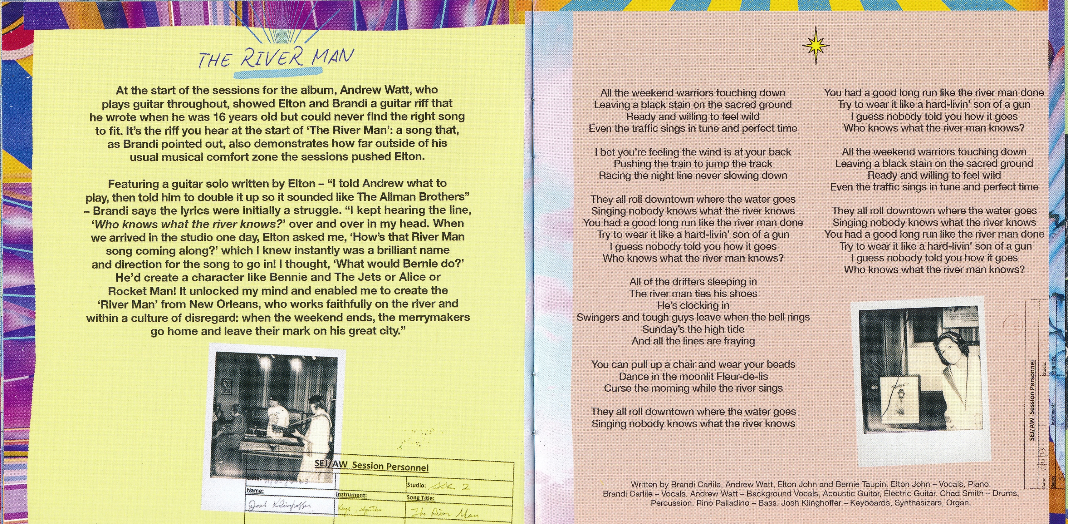 Все треки написаны Брэнди Карлайлом, Элтоном Джоном, Берни Таупином и Эндрю Уоттом; «Роза Лоры Ниро» написана с Лорой Ниро. Все треки, созданные Эндрю Уоттом.