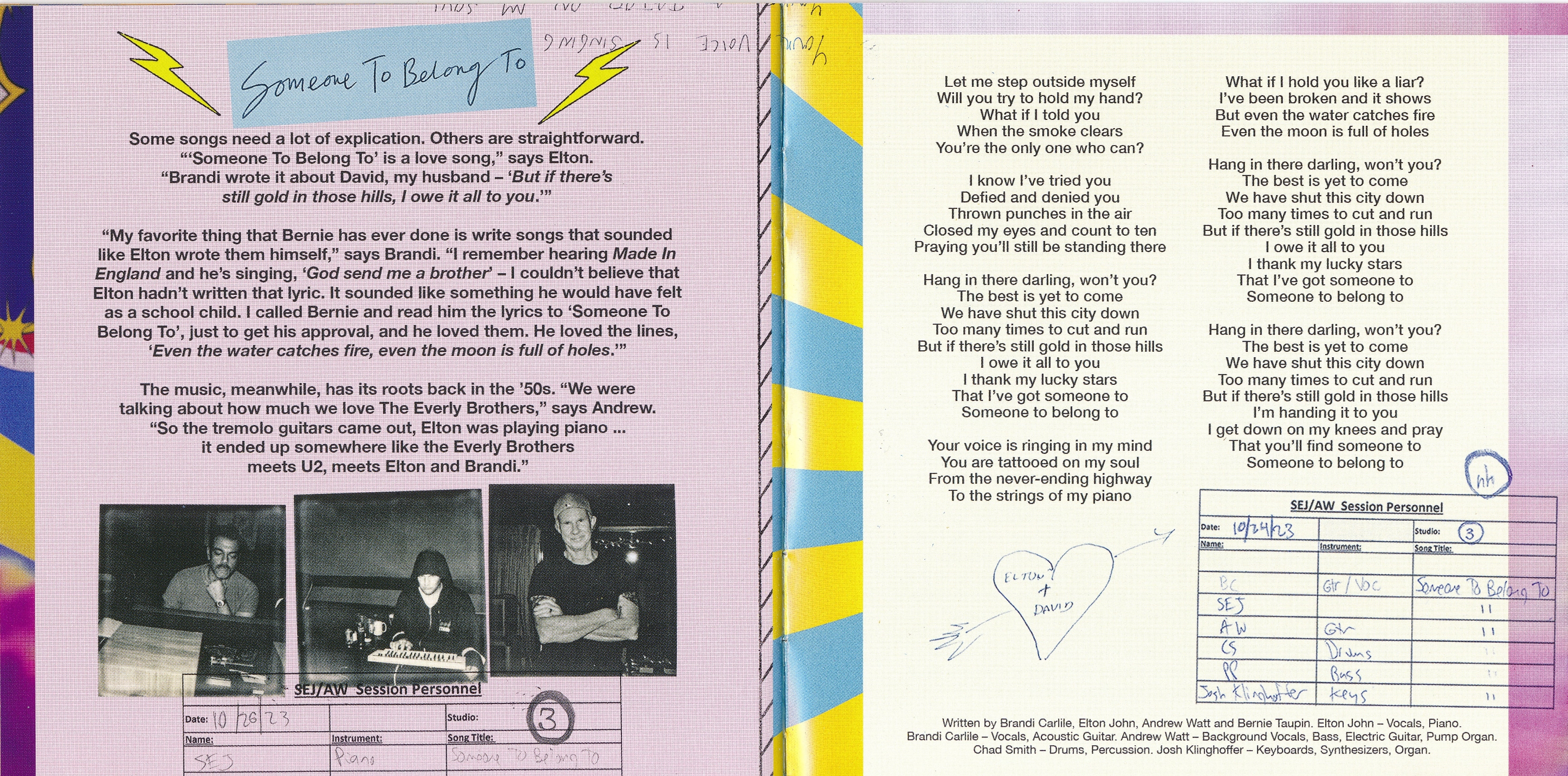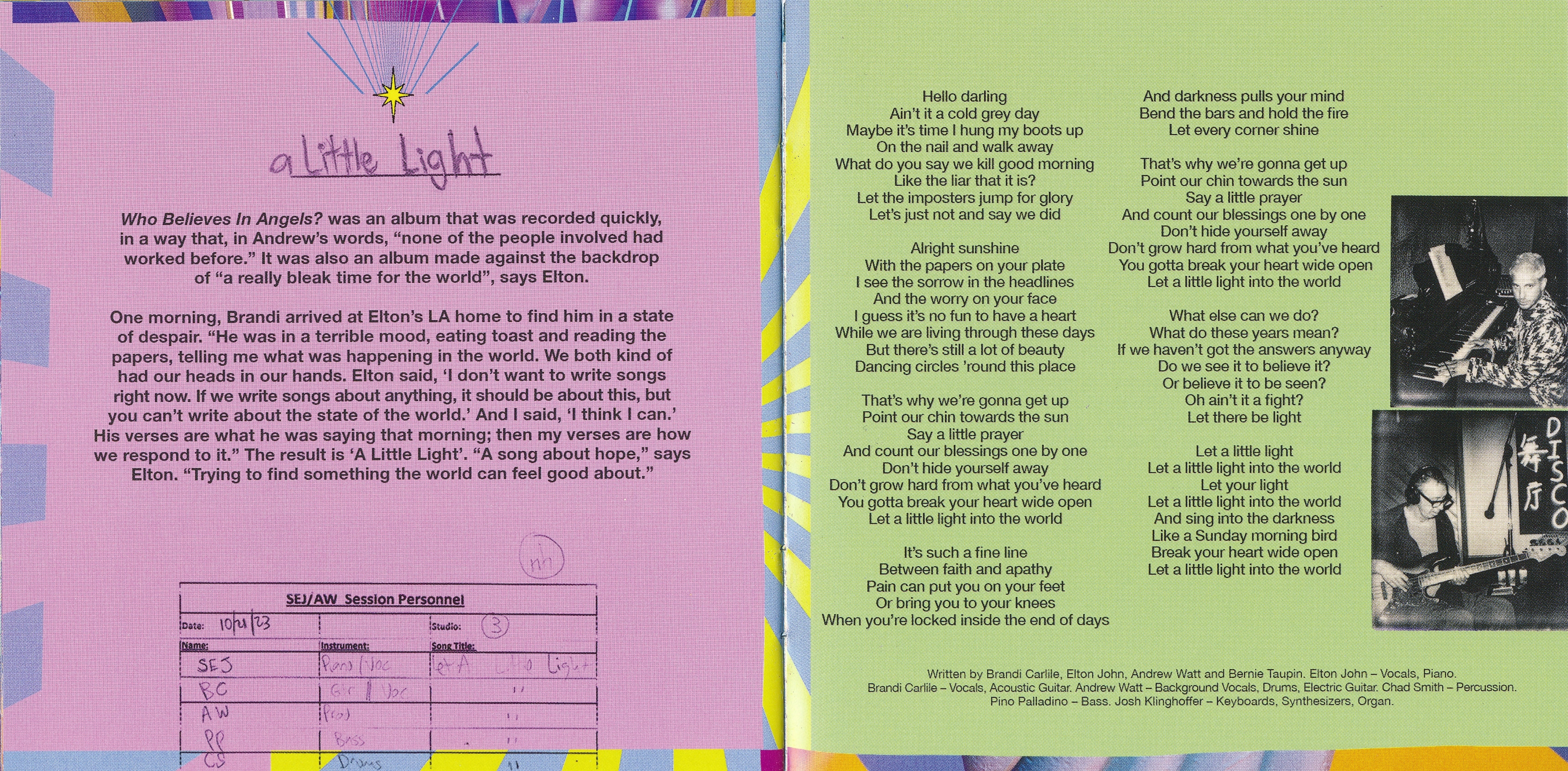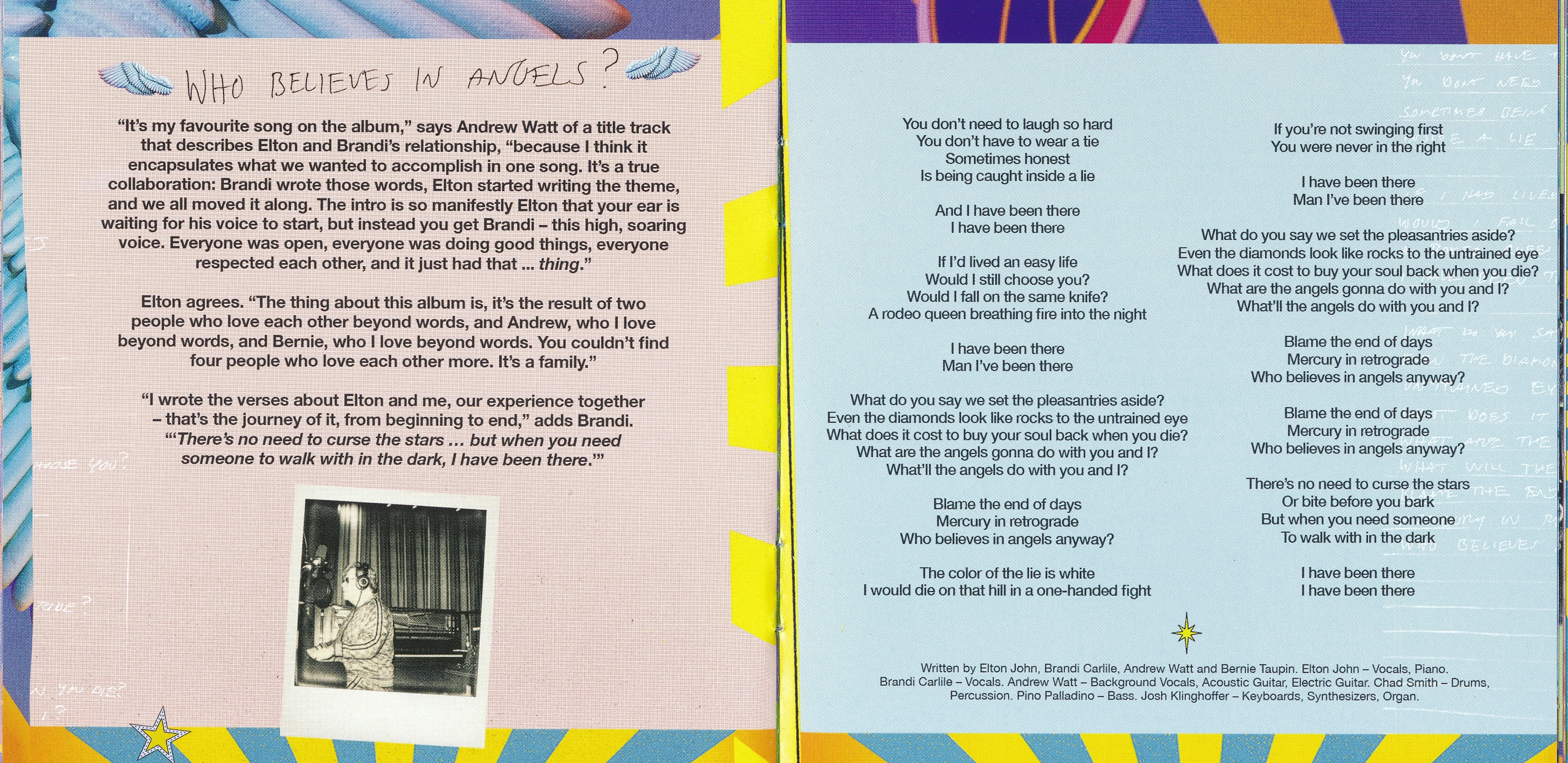 Джон и Карлайл ранее сотрудничали в песне «Simple Things», которая появляется на совместном альбоме Джона The Lockdown Sessions (2021), а также «Никогда не поздно», тема для документального фильма Джона 2024 года с тем же именем; Последний появляется в том, кто верит в ангелов? Ватт также делится написанием песен на альбоме.