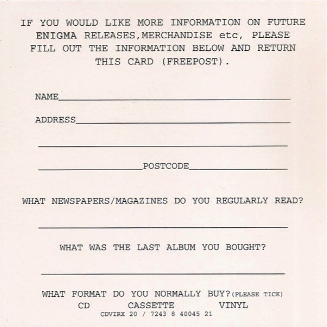 Released in 6-panel Digipak with black Digitray including 12-page booklet with Enigma Mailing card.