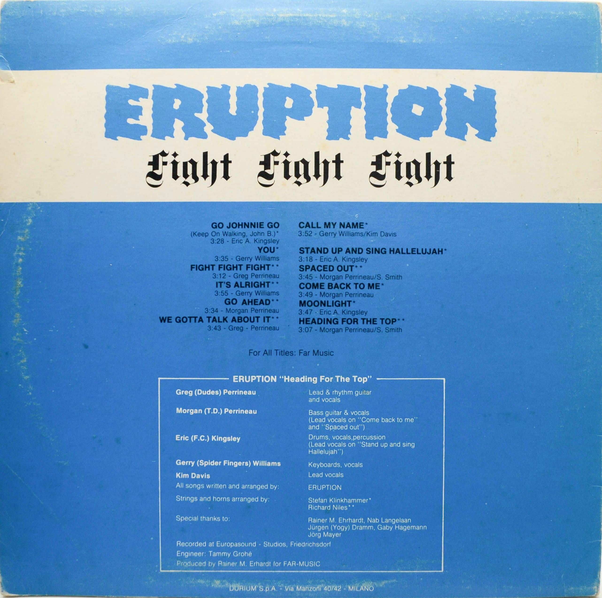 Fight Fight Fight может и не был так раскручен, как предыдущие альбомы Eruption с Прешес Уилсон, но не уступает им в музыке, прекрасным оркестровым аранжировкам - это настоящее диско филадельфийского разлива с ямайскими интонациями в евроупаковке.