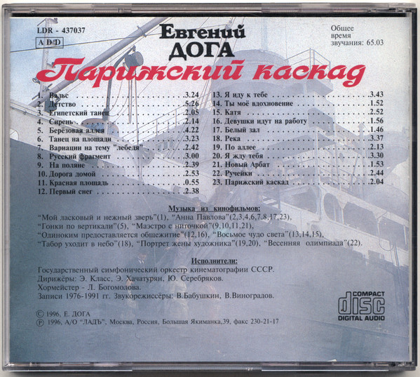Общее время звучания: 65.03 Записи 1976 - 1991 гг. (с) 1996, Е.Дога (р) 1996, А/О "ЛАДЪ"