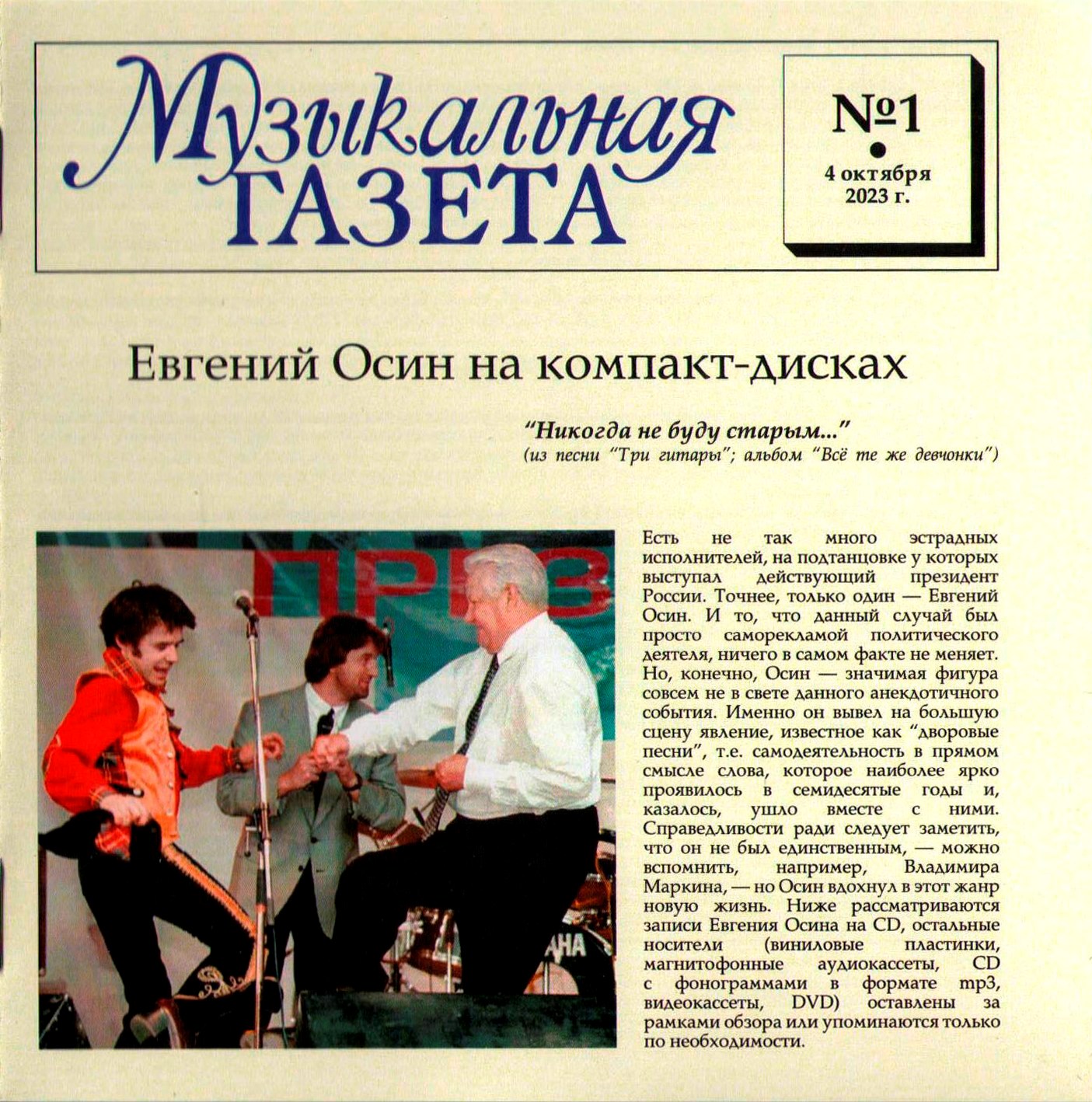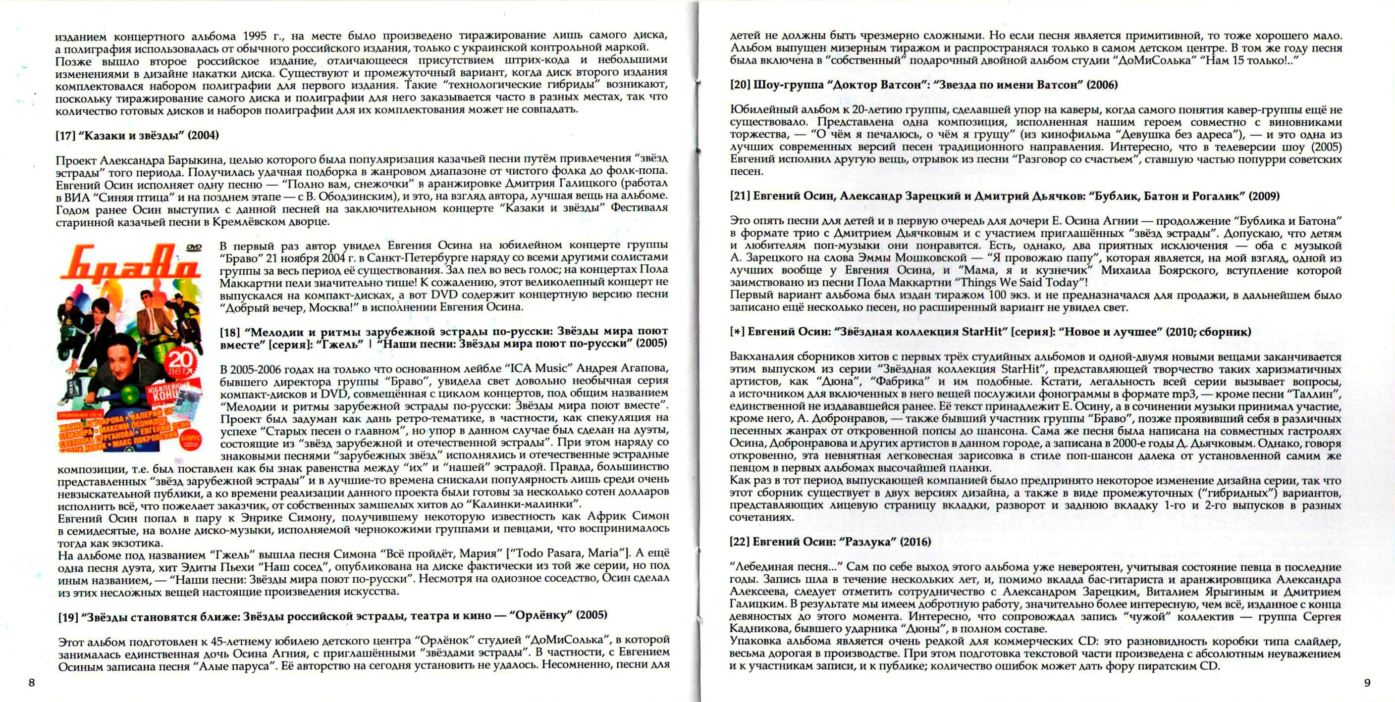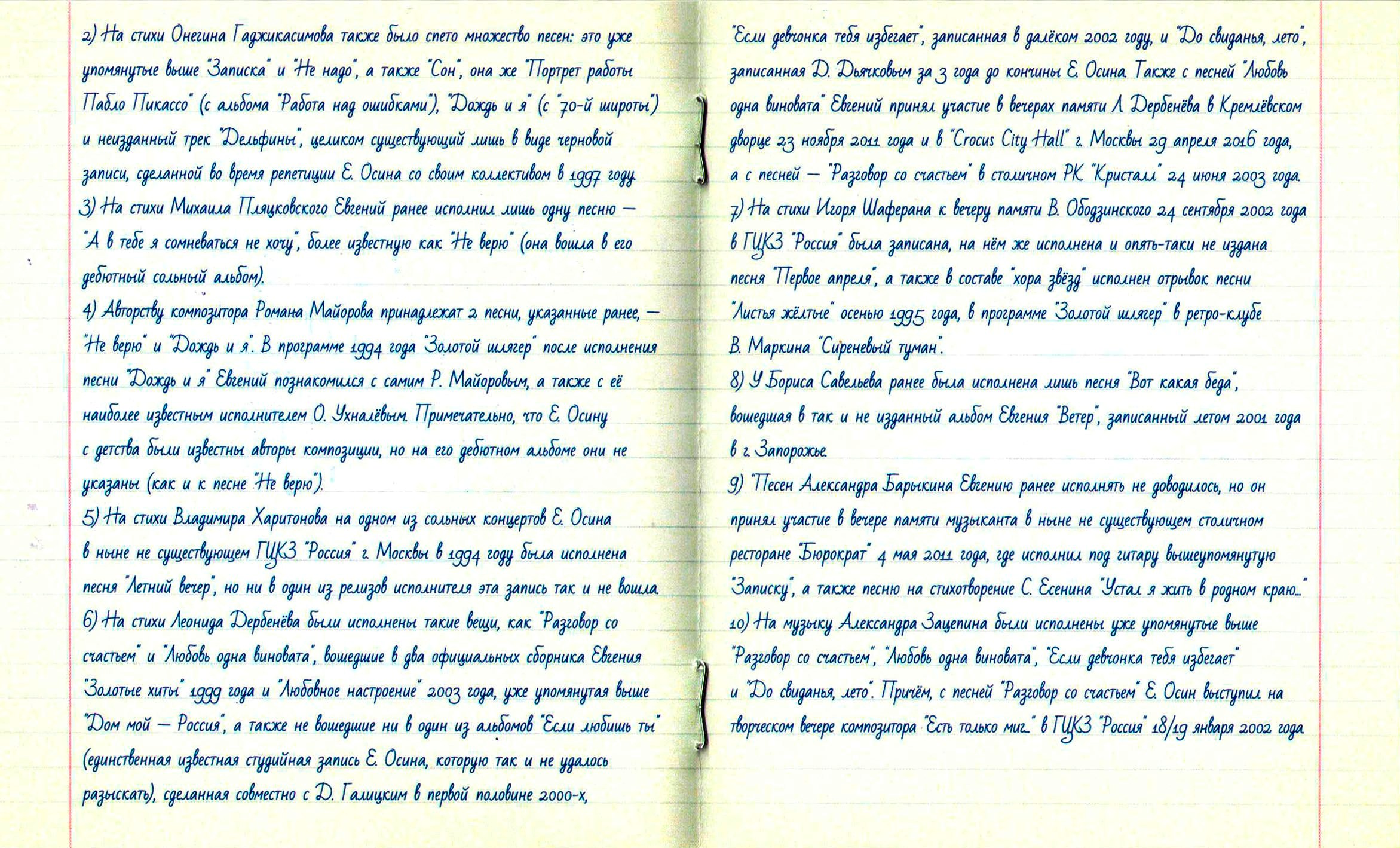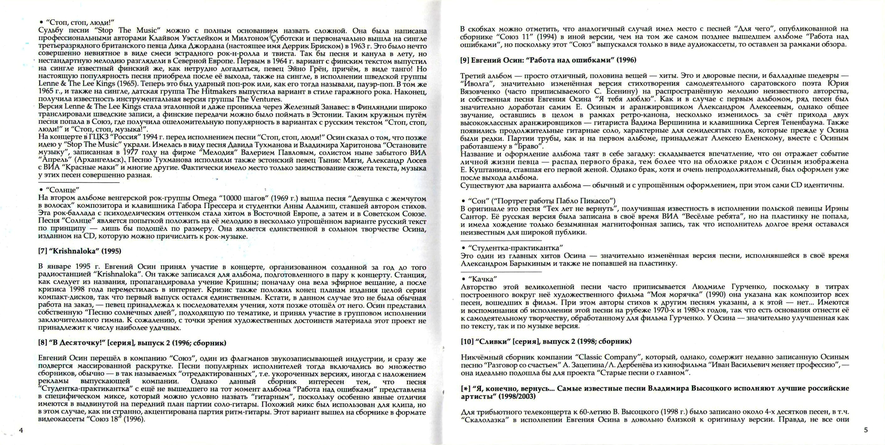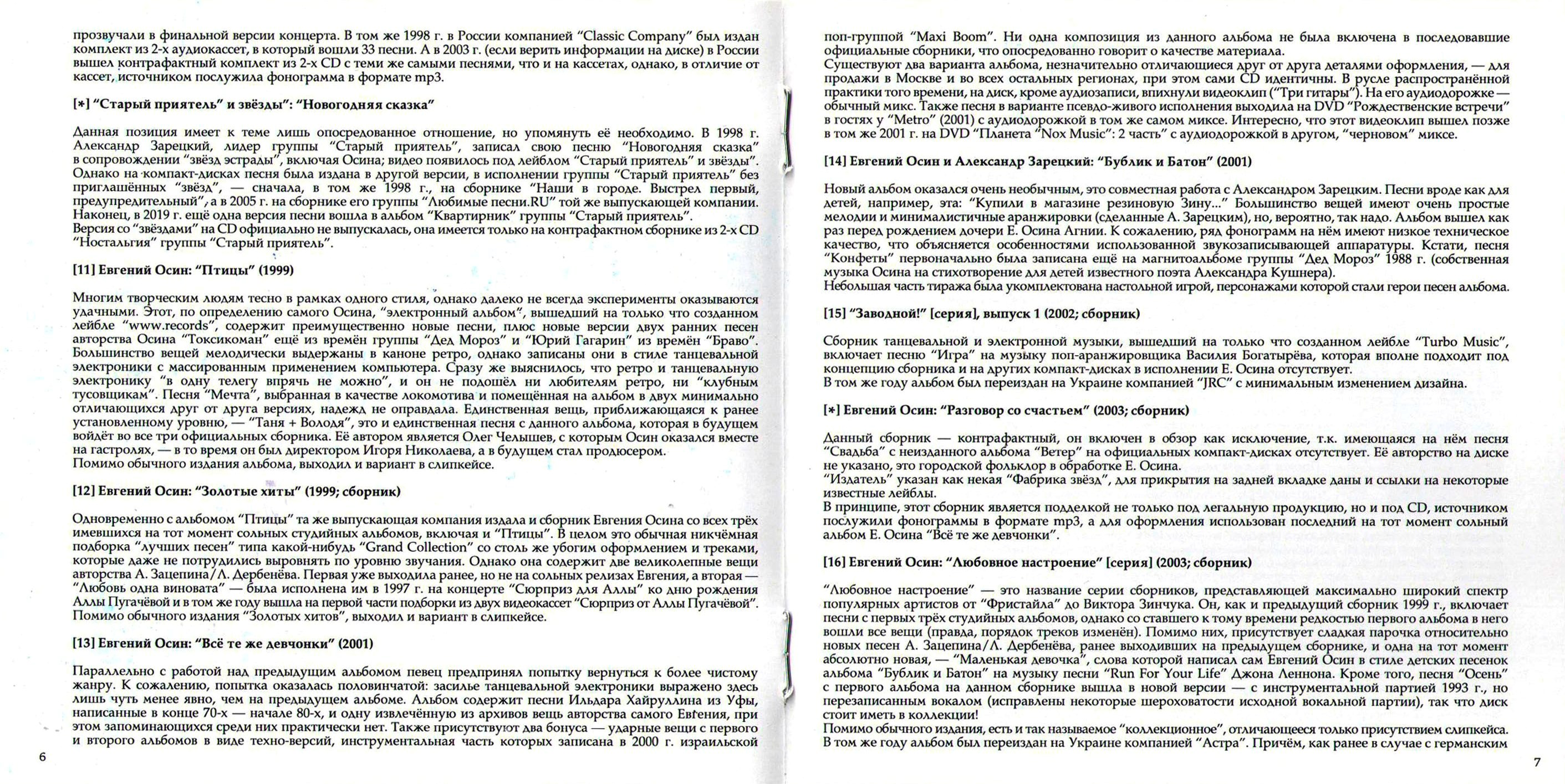 Однако в архивах осталось ещё много прекрасных песен Евгения Осина. Оставим в стороне участие в сомнительных музыкальных проектах, таких, как совместные записи с Пансау Начандой, негром-рэпером из Гвинеи-Бисау, осевшим В Москве (N'Pans: CD "Чёрная сторона легального бизне$$а", 2001), или собственная песня-шутка Осина "Лысый дядя", исполненная им вместе с дуэтом "Новые русские бабки" в телепередаче "Кривое зеркало" (выпуск 27, 2005) и вышедшая впоследствии на DVD серии "Кривое зеркало" "Антология". А вот множество традиционных вещей, знакомых по каноническим версиям ВИА "Весёлые ребята", "Самоцветы", группы "Цветы" или Валерия Ободзинского, были записаны Осиным блестяще, но в своё время не были изданы на CD. Имеются и разбросанные по различным проектам например, "Белый павлин" авторства Осина, совместная работа 1997 года с чешской девичьей панк-группой Ksichties ("Личики"), вышедшая лишь как клип и включенная в сборник "Видео разных лет", или написанная для фильма "Попса" (2004) и прозвучавшая в нём фоном песня в стиле твист Юрия Потеенко и Елены Николаевой "Золотая мечта", а также записанная во время работы над альбомом "Бублик, Батон и Рогалик" (2009) песня Дмитрия Дьячкова "Дочка", - она вышла только на сборнике "Видео разных лет" в сопровождении нарезки домашних видеосъёмок дочери Евгения Агнии.