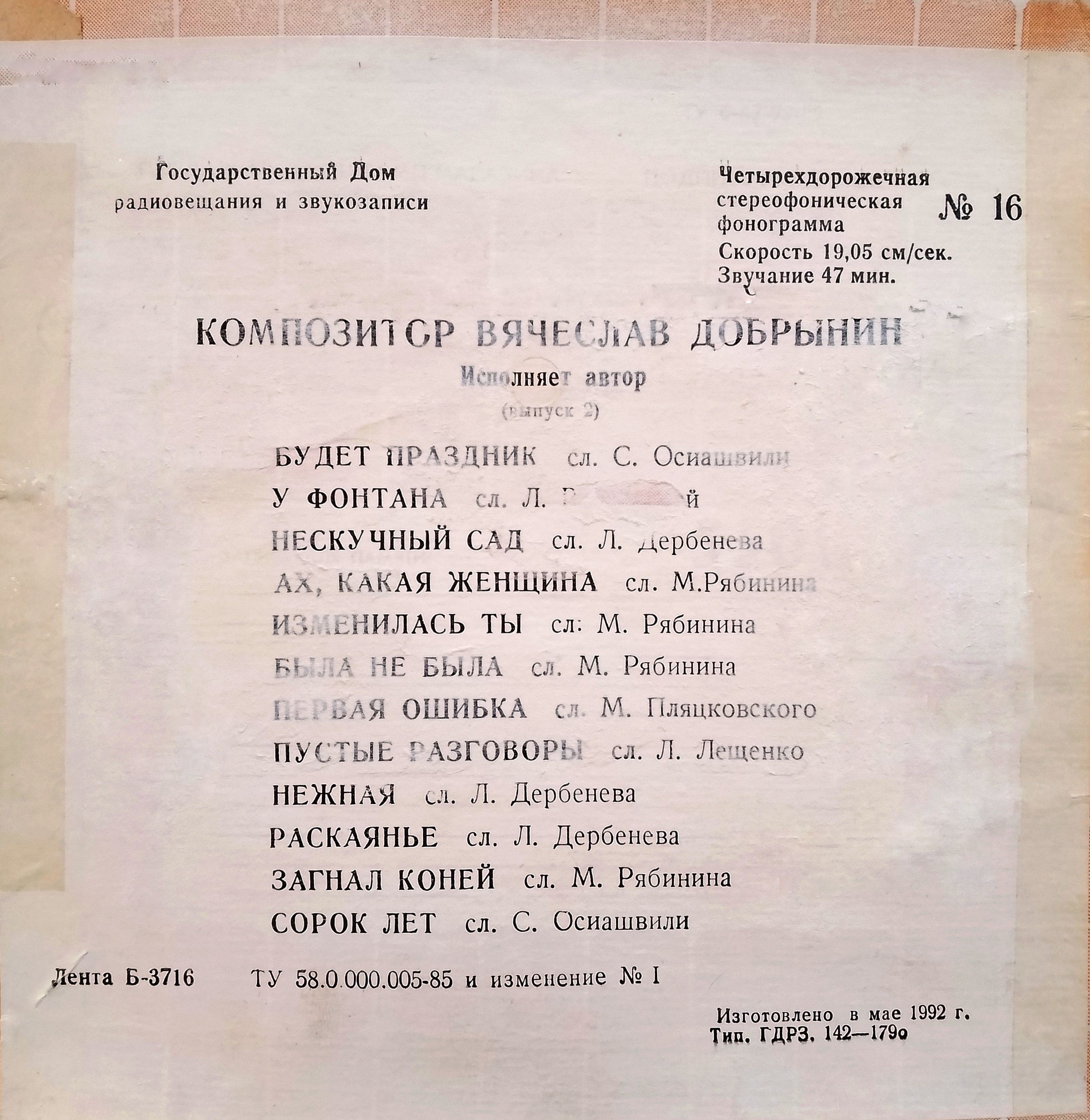 Фонограмма № 16 - Композитор Вячеслав Добрынин. (Третья Нумерация)