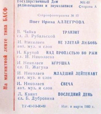 9 Фонограмма для магнитофона Сатурн Мк202с2 (1991 год выпуска)