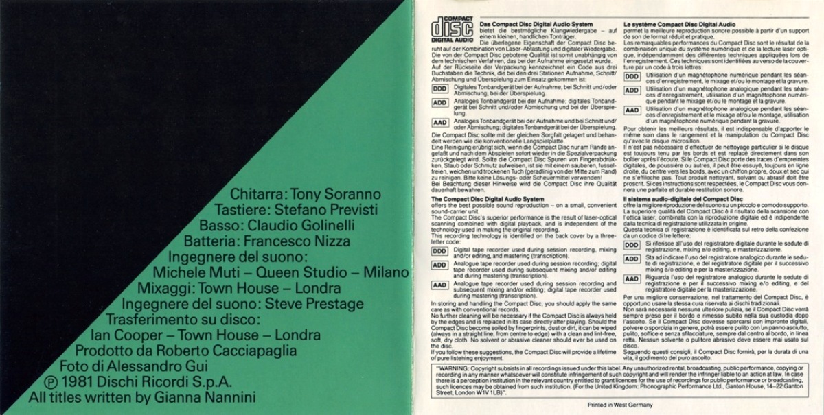 Предлагаю вашему внимаю сканы переиздания этого альбома на CD (Dischi Ricordi S.p.A. 837 139-2). Год переиздания отсутствует.