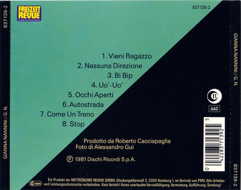 P.S. ~ Это первый альбом, который меня познакомил с этой итальянской Gianna Nannini. Это так было неоднозначно, интересное исполение с хрипотцой песен. И особенно те времена года и место приобретения этого альбома на бобине 375 метров в Студии звукозаписи Дома быта в городе Уссурийке, в 1983 году. Я тогда и сейчас не могу наслушаться, прослушиваю его несколько раз... И вот с тех пор я стал отслеживать её новые альбомы.