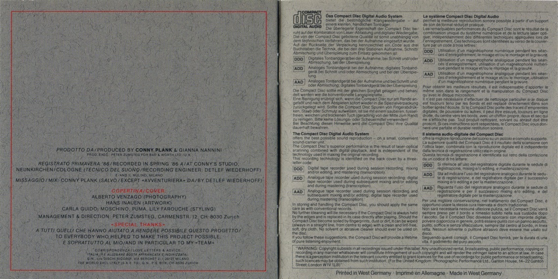 Comes with printed inner sleeve (Italian lyrics and credits) and separate lyrics sheet with German translation.