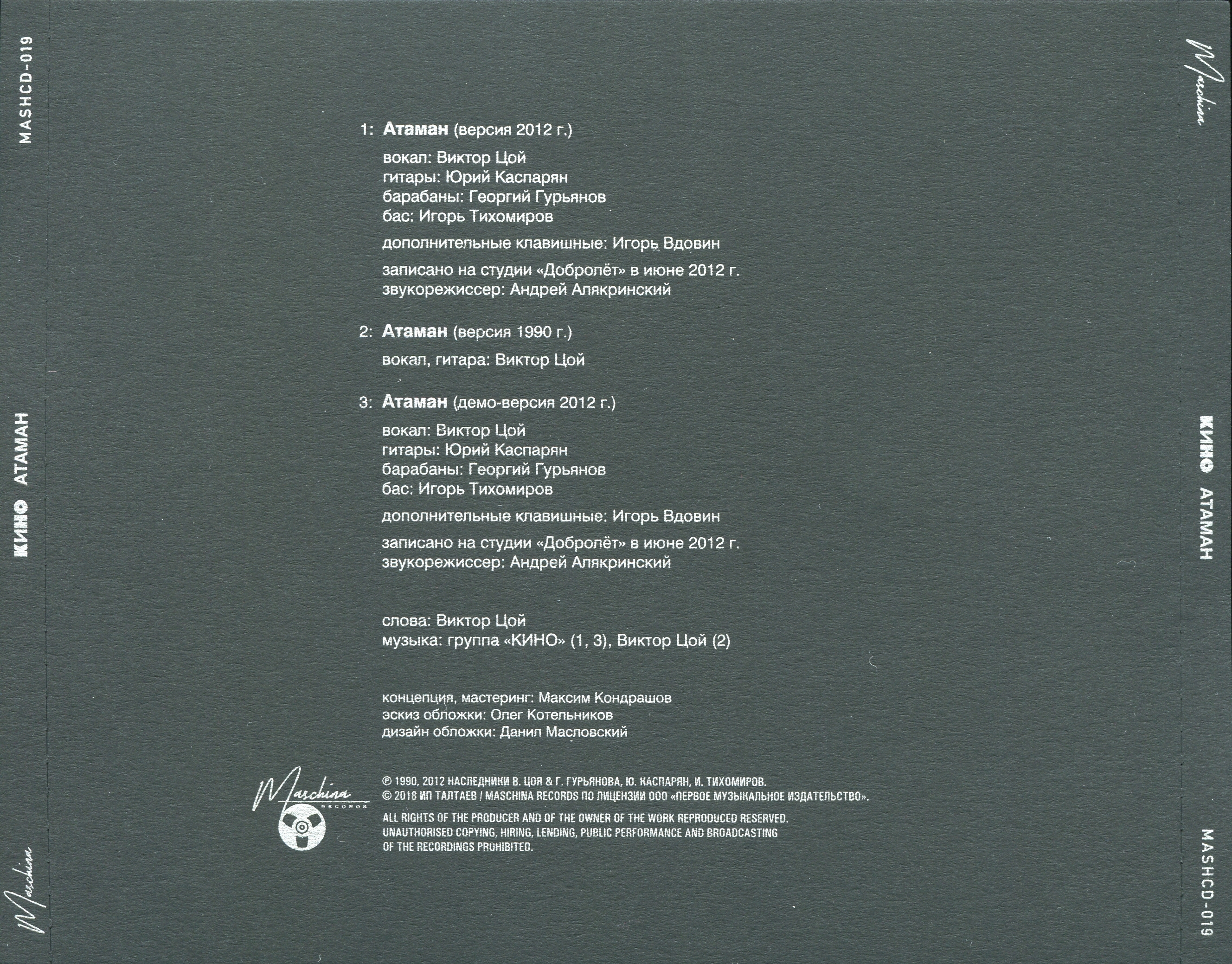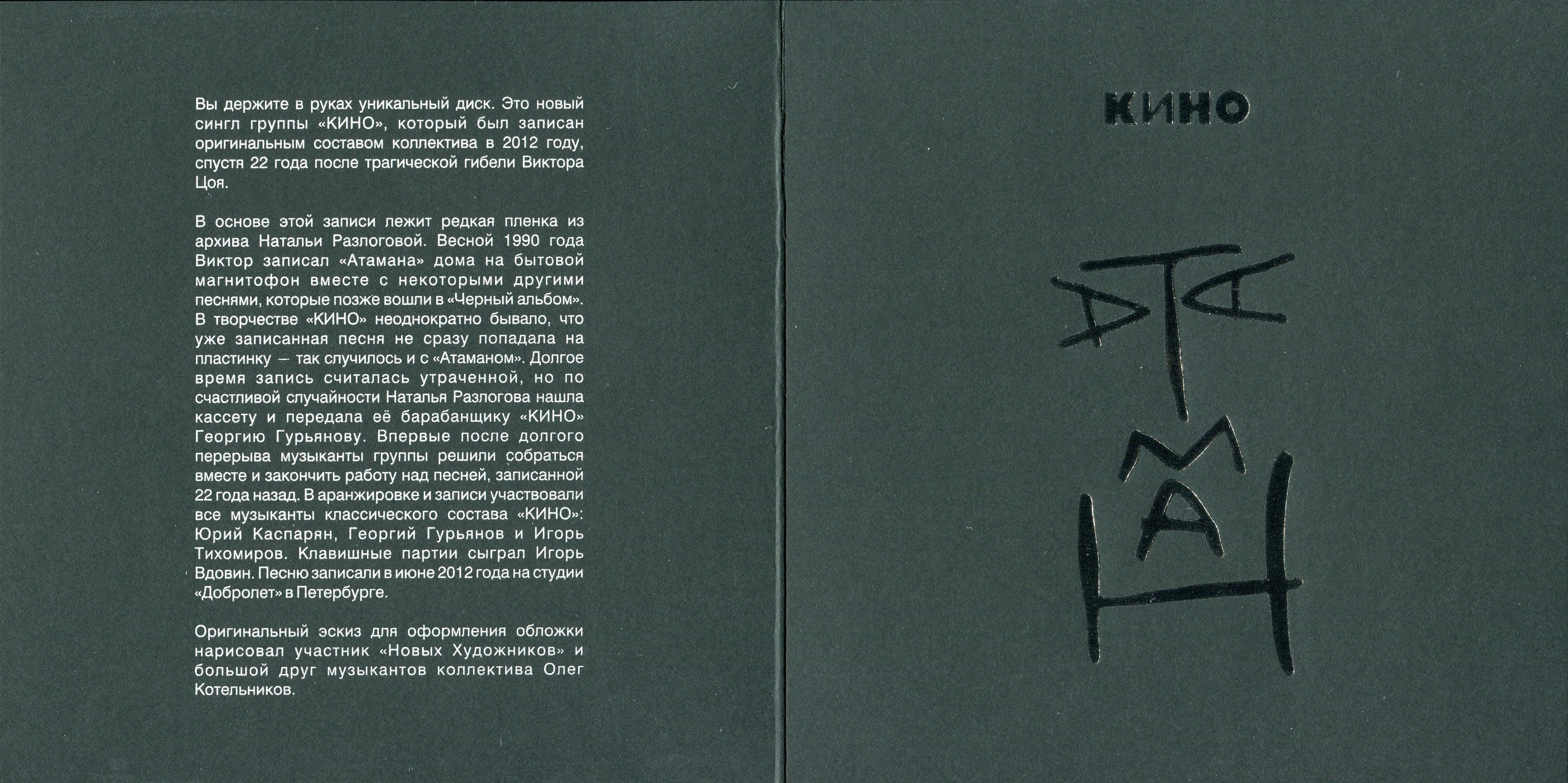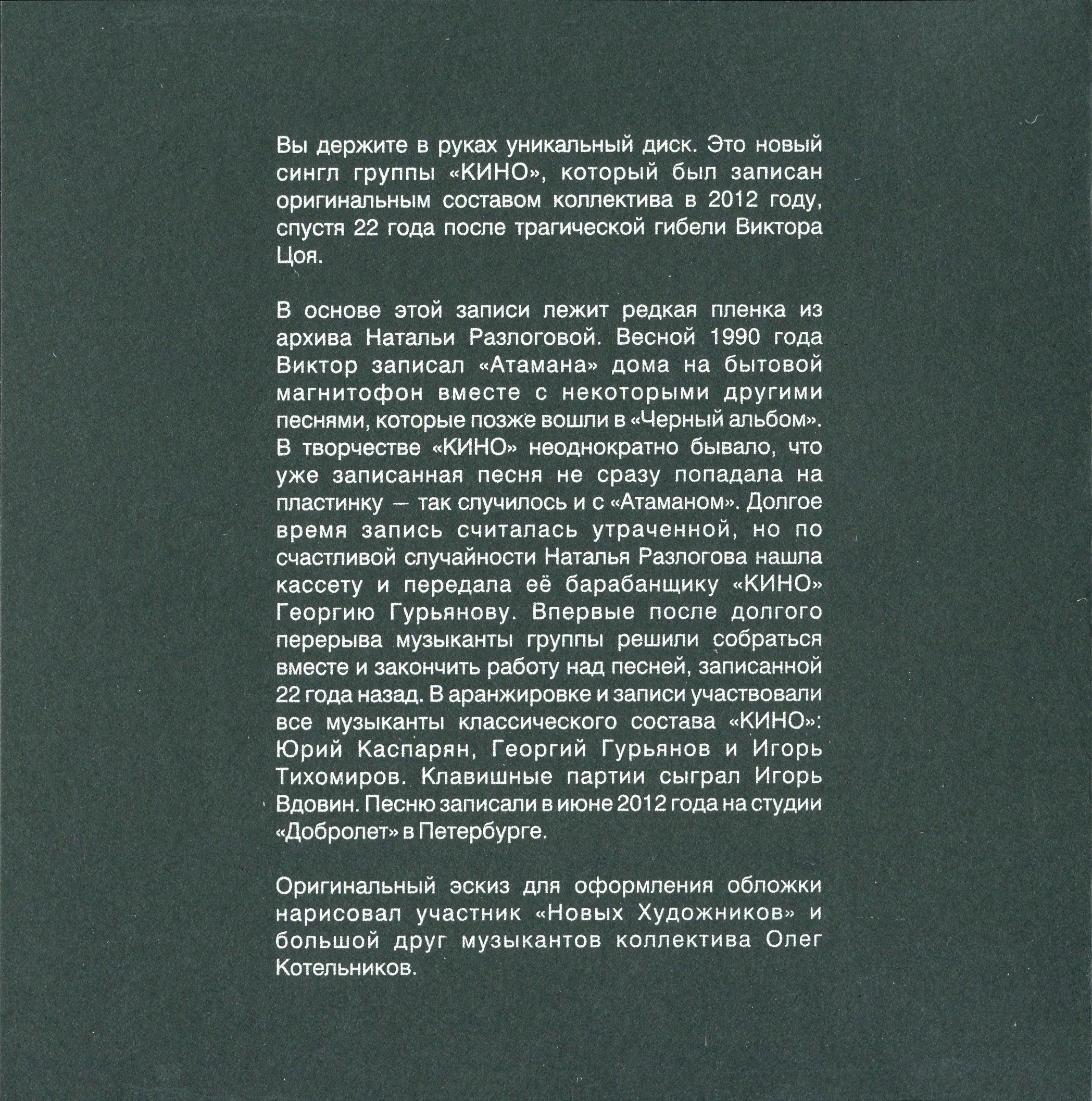 Новый сингл группы «КИНО» «Атаман», записанный участниками оригинального состава коллектива в 2012 году, спустя 22 года после трагической гибели её лидера - Виктора Цоя. Данное издание является первым в рамках серии переизданий записей группы «КИНО», как классических, так и неизданных до сих пор.