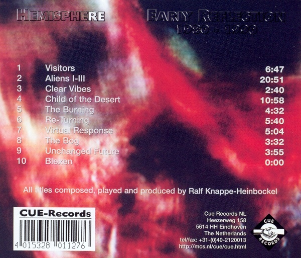 Hemisphere – Early Reflection 1980-1990 Label: Cue Records (Netherlands) – CUE 1127 Format: CD, Album, Compilation Country: Netherlands Released: 1997 Genre: Electronic Style: Electro, Ambient Tracklist ▼ 01 Visitors 6:49 02 Aliens I-III 20:53 03 Clear Vibes 2:47 04 Child Of The Desert 10:12 05 The Burning 4:35 06 Re-Turning 5:41 07 Virtual Response 5:08 08 The Bog 3:37 09 Unchanged Future 3:59 10 Blexen 9:15 Credits▼ Composed By, Performer, Producer – Ralf Knappe-Heinbockel Design [Graphic] – Robert Marselje Mastered By [Premastering] – Ralf Knappe-Heinbockel, Ron Boots Photography [Cover] – Ute Heinbockel Notes▼ Composed, performed and produced during 1980-1990. Premastered at the Dreamscape Studio, Eindhoven, in March 1997. Instrumentation includes Roland System 700, PPG 2.2, Yamaha CS 30, Kiwi, Korg Polysix and Moog Prodigy.