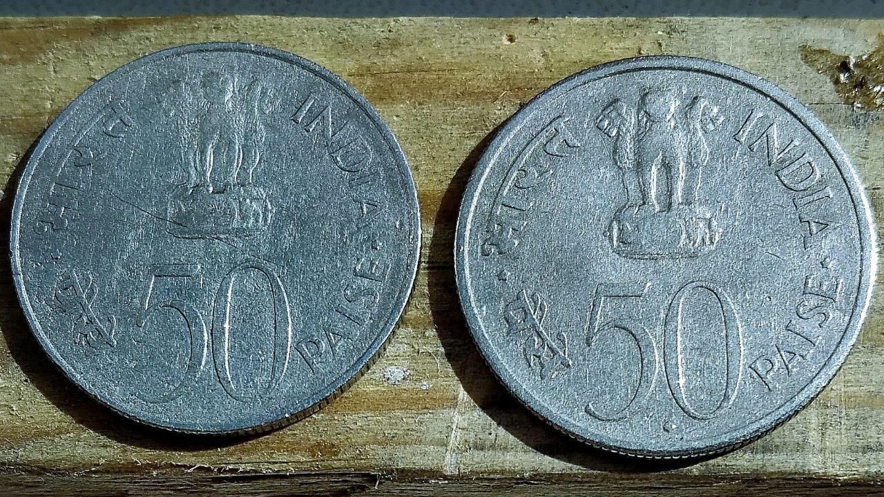 Монета без отметки монетного двора - отчеканена в Калькутте, она стоит дороже, чем монета с отметкой "♦" под цифрой 50 (отчеканена в Бомбее).
