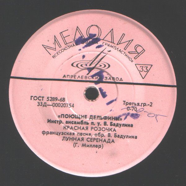 Инструментальный ансамбль Поющие дельфины п-у В. Бадулина Д 00020753-4 1967 01. Вечер на рейде (В. Соловьев-Седой, обр. В. Бадулина); 02. Вальс-шутка (Д. Шостакович, обр. В. Бадулина); 03. Красная розочка (французская песня, обр. В. Бадулина); 04. Лунная серенада (Г. Миллер)
