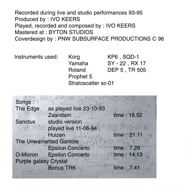 Автор композиции, записи, исполнитель, продюсер — Иво Кирс Дизайн [обложка] — PNW Subsurface Productions Трек 1, исполненный вживую 23.10.93, Заандам. Трек 2, студийная версия, исполненная вживую 11.06.94, Хейзен. Треки 3 и 4, Epsilon Concerto. Трек 5 — бонус-трек. Записано во время живых выступлений и в студии в 1993–1995 годах.