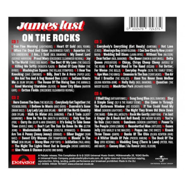 В этот 4-дисковый сборник «James Last On The Rocks» впервые вошли все лучшие рок-композиции Джеймса Ласта, записанные с группой вокалистов, которых он лично отобрал в лондонских студиях звукозаписи: в его группу JAMES LAST COMPANY входили Сью Гловер и Санни Лесли (из Brotherhood of Man), Марго Квантрелл и Джин Райдер (из Breakaways), Лин Корнелл (из Pearls), Кей Гарнер (из Ladybirds), Тони Берроуз (из Edison Lighthouse), а также студийные вокалисты Нил Ланкастер и Питер Барнфазер. Они составляют ядро зажигательного рок-звучания Джеймса Ласта.