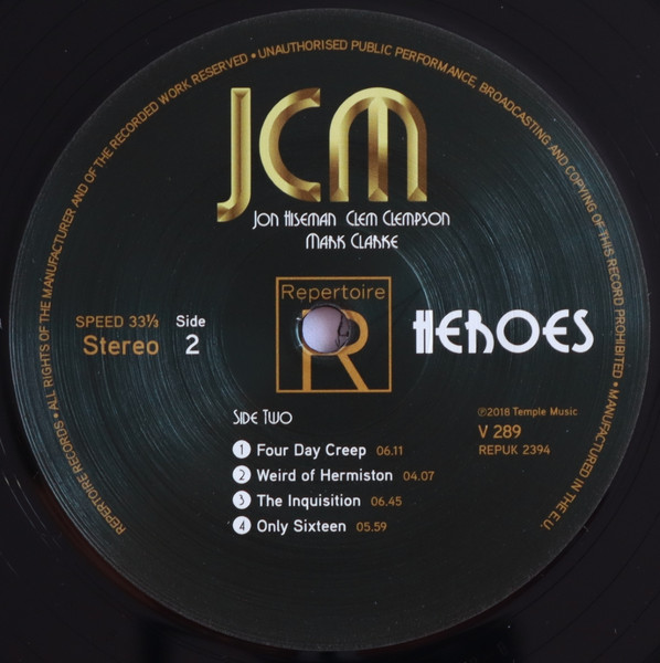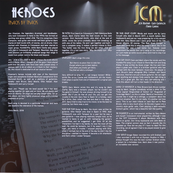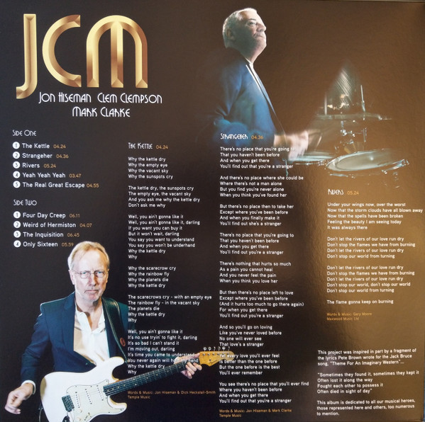 Джон Хисман сформировал новую захватывающую группу под названием JCM (Jon,Clem,Mark). Трио состоит из Клема Клемпсона на соло-гитаре и вокале, Марка Кларка на басу и лид-вокале и, конечно же, Джона на барабанах. Джон: “Мне всегда нравится создавать альбомы с определенной тематикой. Когда я подумал обо всех парнях, с которыми играл на протяжении многих лет и которые, к сожалению, уже ушли из жизни, мне показалось правильным выпустить альбом в память о них. Так что эта пластинка посвящена всем нашим музыкальным героям. Среди героев Хисемана — Грэм Бонд, игравший на органе Хаммонда и саксофоне, и саксофонист Дик Хекстолл-Смит, а также множество гитаристов, в частности Джек Брюс, Гэри Мур, Олли Холсолл, Алан Холдсворт и Ларри Кориэлл". Дебютный альбом JCM уже назвали «потрясающим».