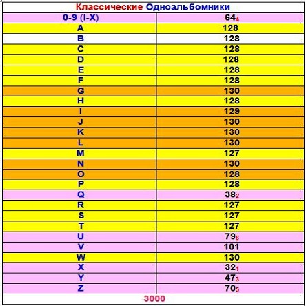 Примечание: Расположение Классических Одноальбомников в списке-таблице предпочтительно равномерное по количеству, с целью чего и производится их выравнивание. Числа с цифрой означают, что нахождение КО на данную букву (цифру) фактически неосуществимо, имеющиеся к этому возможности исчерпаны.