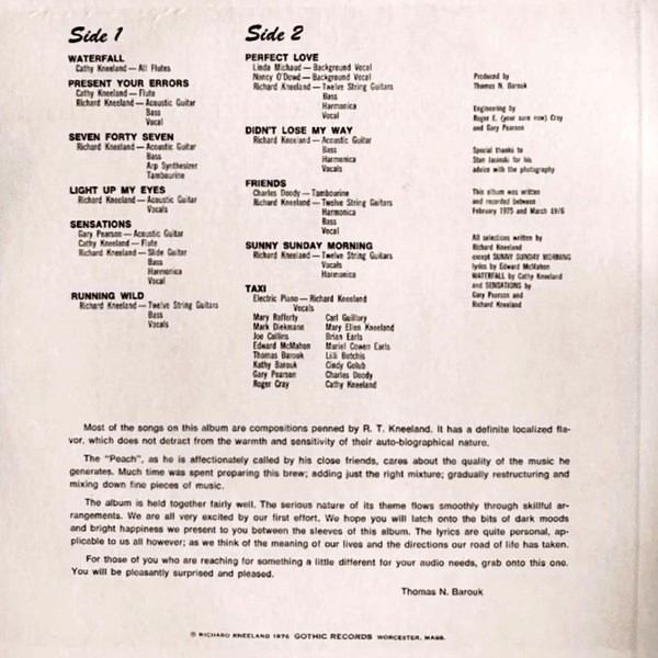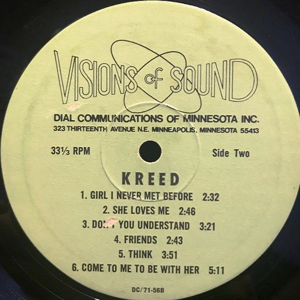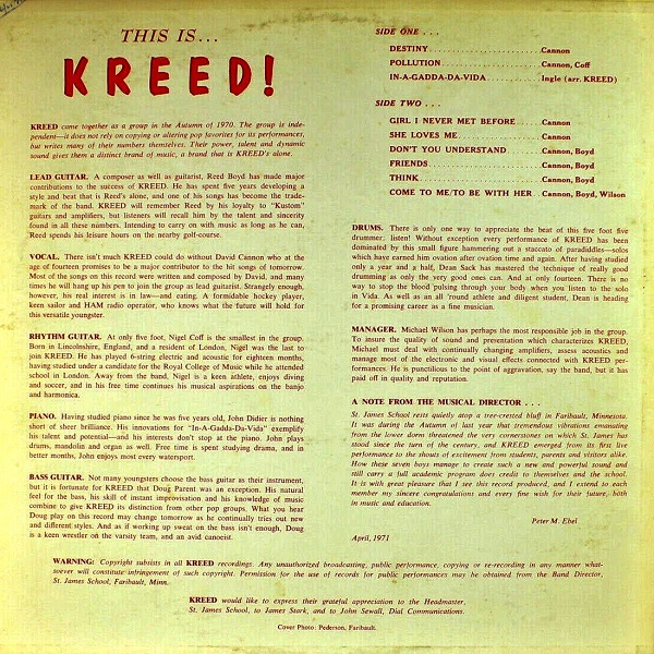 Единственный альбом из далёкого 1971 года, выпущенный частным образом и ограниченным тиражом миннесотской группой Kreed. Существует определённая аудитория для грубо спродюсированных/записанных альбомов, выпущенных взрослыми, лишёнными таланта, или молодыми подростками со сравнимыми способностями. Этот LP как раз относится к последней категории. И хотя он может не понравиться даже многим поклонникам "гаража", он источает некий действительно причудливый шарм. В примечаниях на задней стороне обложки пластинки не указан возраст участников группы, но судя по изображению на передней стороне, им в среднем было где-то по 14 лет. Имея это в виду, можно быть гораздо более снисходительным, оценивая данный примитивно звучащий LP, и это, точно, не разрушит ваш мир. В основном здесь баллады, но с относительно точным и довольно интересным кавером на классику калифорнийской группы Iron Butterfly с расширенным барабанным соло (вообще барабанщик выглядит одним из их наиболее талантливых исполнителей).