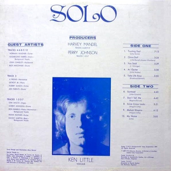 Kenneth 'Ken' Little – американский автор песен и вокалист из Чикаго, которого взял под свою опеку сам мистер Harvey Mandel, известный своим инновационным подходом к игре на электрогитаре. Он и Perry Johnson стали продюсерами первой и единственной сольной пластинки Кена, которая была названа предельно просто и скромно "Solo". Альбом вышел на лейбле "Dharma Records" в 1973 году. Кен отметился ещё на столь же редком, как и его сольник, альбоме за авторством коллектива Ken Little And The Spoon River Band под названием "Leanin' On The Bar" (1976), изданном на том же лейбле.