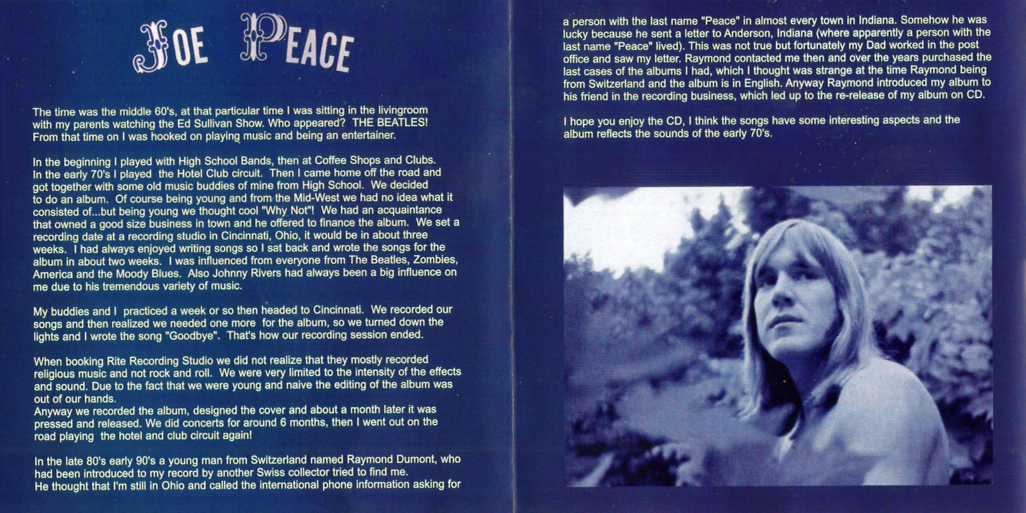 Джо Пис — певец и автор песен, записавший и выпустивший в частном порядке свой единственный альбом в Огайо, после долгих гастролей по штату. Копии оригинальной пластинки в наши дни стали большой редкостью, а сам LP со временем приобрёл статус культового среди коллекционеров. Вдохновлённый творчеством соотечественников Джонни Риверса и группы Buffalo Springfield, а также своими размышлениями, сделанными в разъездах, Джо создал десять запоминающихся и самобытных песен. Музыкальный спектр композиций простирается от мелодий западного побережья, лоннер-фолка до тяжёлого психоделического гаражного рока с насыщенным грувом, глубоким и энергичным вокалом в сочетании с потрясающими фузз-гитарами.