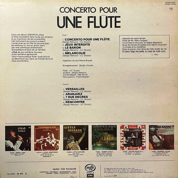 Zébaron - это псевдоним флейтиста Жана-Клода Гоццо и его приятеля-гитариста Сержио Ренуччи, которые вместе сочинили большую часть мелодий своего единственного LP. Однако то, что действительно выводит «Concerto Pour Une Flûte» из статуса творения тщеславного дуэта, – это сплочённая ритм-секция в лице уважаемого джазового басиста Жильбера Ровера (среди тех, с кем он работал, Декстер Гордон, Дюк Эллингтон, Кэннонболл Эддерли, Марсьяль Солаль, Рене Тома и другие), и надёжного барабанщика Фреда Десплана, которые подходят к данной записи так же идеально, как к любой сессии джазового ансамбля.
