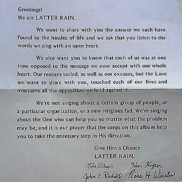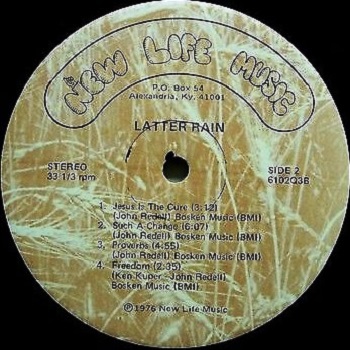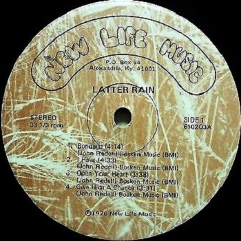 Джон Ределл, Кен Купер, Майк Уилсон и Росс Уилсон были Latter Rain, блюзовой/классической рок-группой из Кентукки с несколькими прогрессивными влияниями и постоянными призывами к Иисусу в песнях. Материал их единственного одноимённого альбома движется в русле типичного американского хард-рока с множеством психоделических наклонностей и эпическим вокалом, сопровождением которого являются молниеносные электрогитары и несколько интересных работ на фортепиано и органе. Много звуков «вау-вау» и соло, а также обильных переходов в более мягкие аранжировки в духе соотечественников из Висконсина Sunblind Lion. Не путать с дуэтом с таким же названием из Южной Каролины, который также выпустил одноимённый альбом в 1982 году с похожим текстовым содержанием.