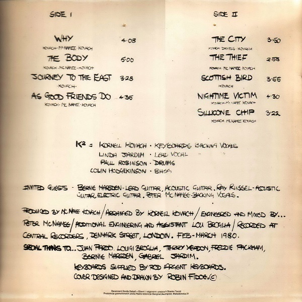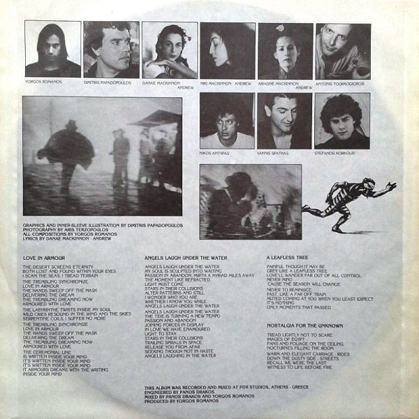 Троица композиторов из другого столичного коллектива Socrates, выпустившего свой потрясающий LP «Plaza» в том же 1983 году: басист Антонис Туркогиоргис, гитарист Яннис Спатас и барабанщик Никос Антипас, плюс ещё двое гитаристов: Гиоргос Романос и Димитрис Пападопулос, тоже композитор и пианист Стефанос Корколис, и три греко-канадские сестры-вокалистки Маккиннон-Эндрю: Даная, Ники и Ариадна, последняя к тому же и клавишница.
