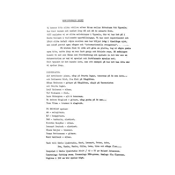 Загадочные, и видимо малоизвестные, шведы-однопластиночники. Обложка уже хороша, а музыка ещё лучше! Семь длинных треков до 11-ти минут. Может быть вокальные партии немножко бледновато выглядят, но музыка прекрасна. Отличная гитарная работа - изобретательная, кисловатая, с мелодичным фузцом местами... Клёвые духовые (саксофоны, труба) в аранжировках... Немножко скрипочки расстроенной какой-то... Альбом обрамлён более легковесными и весёлыми по настроению композициями - песней "Terroristen" и инструменталом "Skookian". А внутри - гораздо более серьёзная "Indianens Blod". Длинный сдвоенный инструментал "Linas Lek / Gånglåt Från Vettet", с хорошим мистическим началом и разнообразным содержимым. Тягуче-блюзовая "Svart Dagar, Svarta Nätter". Мелодично-хитовая и мрачноватая "Se Men Inte Röra"... В итоге - не слишком сложный и кривой, но в то же время очень крепкий, интересный и в чём-то неожиданный альбом!
