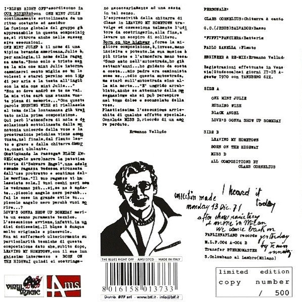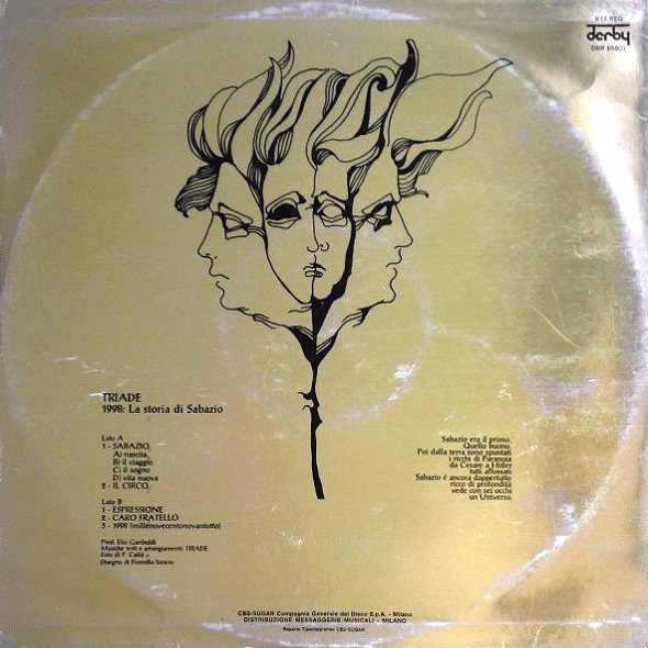 Один из самых редких итальянских релизов, выпущенный в своё время в количестве 500 экземпляров и упакованный в мешковину с трафаретным названием пластинки, а также литографией венецианского художника Витторио Базальи.