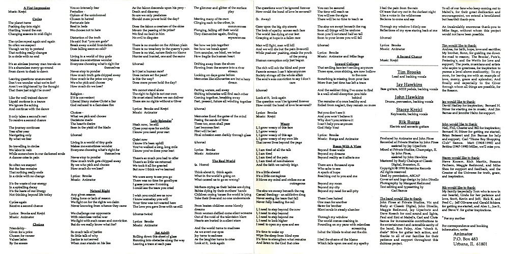 ANIMATOR - нео-проговая группа из Иллинойса с симфоническим исполнительским подходом. Звучание группы больше напоминает британскую, чем американскую прогрессивную сцену, и его часто сравнивали с работами коллективов IQ и PALLAS конца 80-х годов. Но всё-же саунд таких групп, как YES, MARILLION и, особенно, канадцев RUSH середины периода их деятельности, лучше всего характеризуют материал этих американцев.