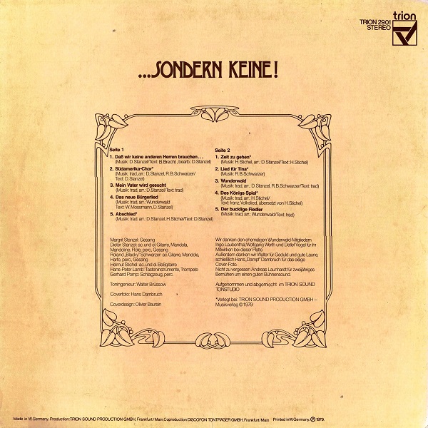 Не совсем обычный немецкий фолк-рок, с несколькими замечательными сольными гитарными вступлениями. В целом, более-менее изобретательный альбом, достойный внимания, хотя и довольно неровный. Крайне редкое частное издание, которое, разумеется, ещё ни разу и ни в каком виде не перевыпускалось.