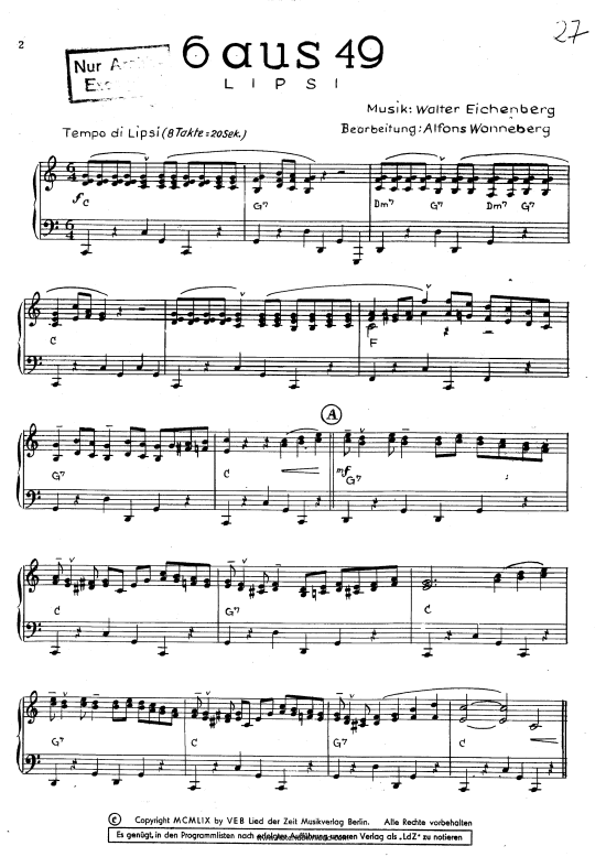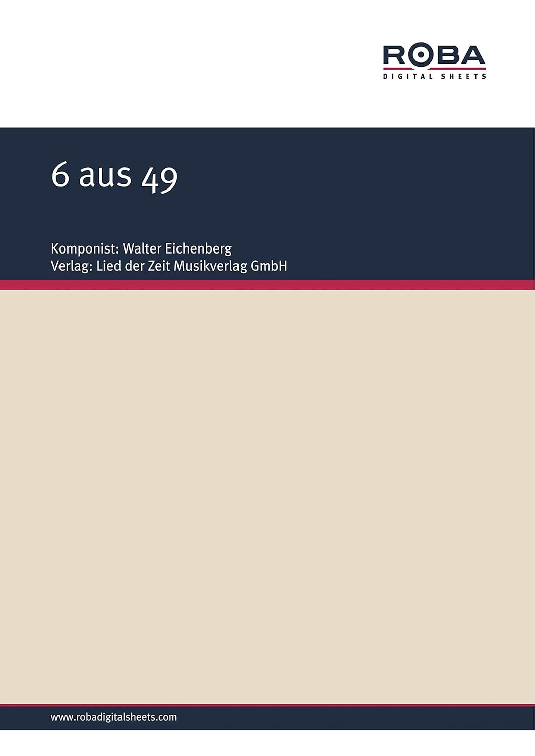 Эта электронная книга содержит ноты песни до мажор для фортепиано, вокала и гитары. Книга «6 из 49» выпущена издательством Lied der Zeit Musikverlag GmbH и относится к следующим категориям: фортепиано, Lied der Zeit, клавишные, фортепианное издание, старинная музыка, ноты, фортепиано.