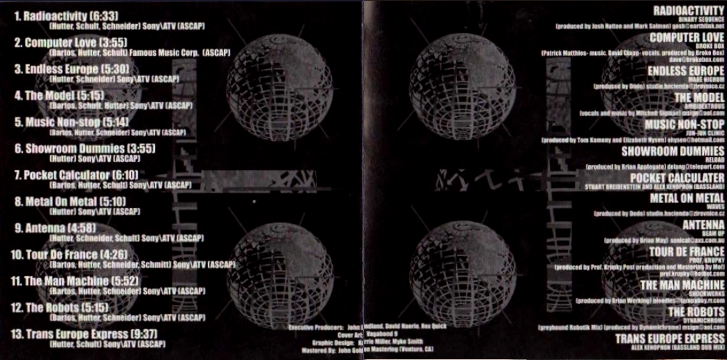 Masterful renditions of Kraftwerk's innovations are powered high-tension melodies and stringed beats. The tracks oscillate with wired blue-rave grooves, lapping at your ears like the ebb and flow of a gentle stream. The background swirls with moody symphonica, often dark and foreboding Nuclear powered samplers jack up the tech decks to a new level.