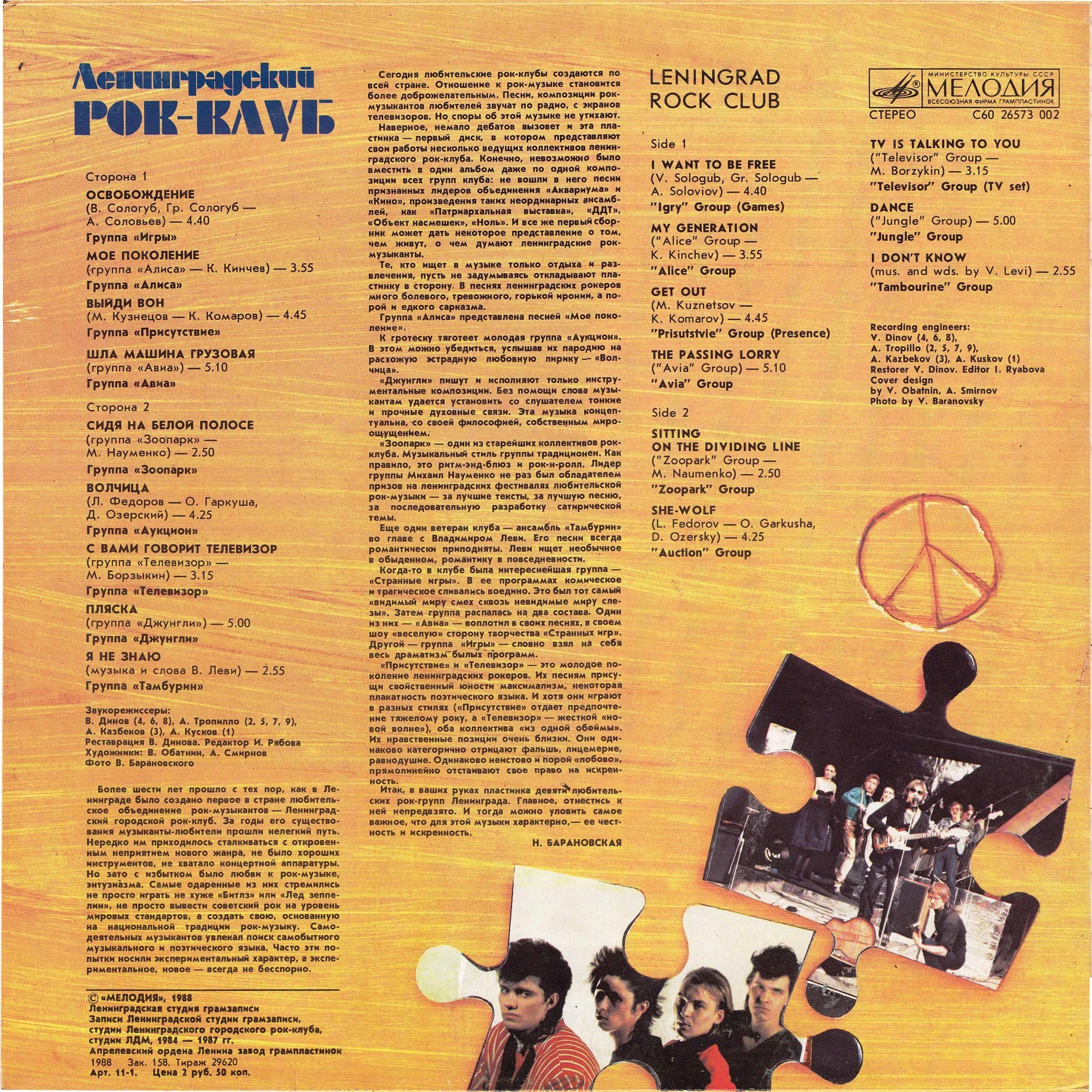 Наверное, немало дебатов вызовет и эта пластинка — первый диск, в котором представляют свои работы несколько ведущих коллективов ленинградского рок-клуба. Конечно, невозможно было вместить в один альбом даже по одной композиции всех групп клуба: не вошли в него песни признанных лидеров объединения «Аквариума» и «Кино», произведения таких неординарных ансамблей, как «Патриархальная выставка», «ДДТ», «Объект насмешек», «Ноль». И всё же первый сборник может дать некоторое представление о том, чем живут, о чём думают ленинградские рок-музыканты.