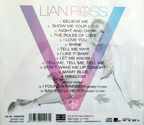 Фаворитка «Евродиско» Лиан Росс возвращается с V, новой стильной коллекцией, в которой её классический музыкальный блеск сочетается со свежей энергией европопа. Известная такими поп-шедеврами, как Say You’ll Never и Fantasy, Лиан с лёгкостью переключается между плавными танцевальными хитами и нежными балладами, напоминая слушателям, почему она остаётся такой любимой исполнительницей в этом жанре.