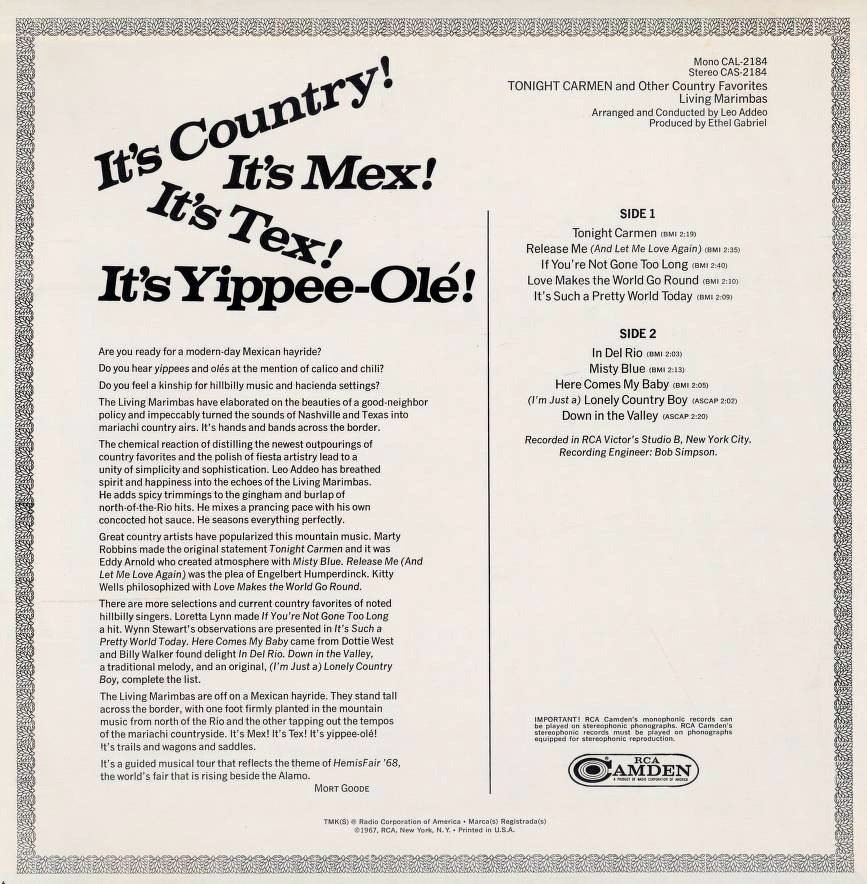 Living Marimbas - Tonight Carmen And Other Country Favorites (1967)