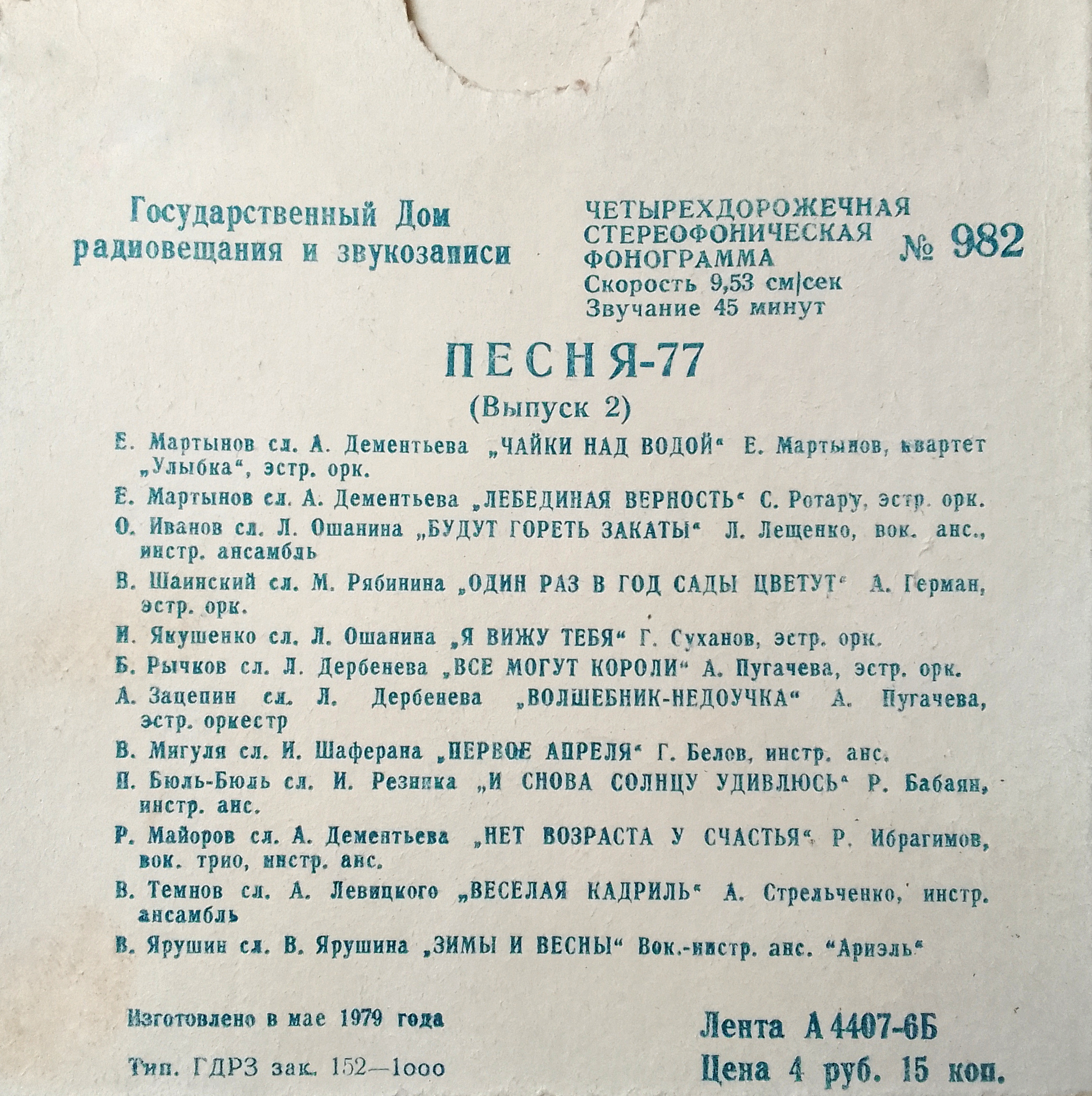 Стерео. Вся запись сохранилась. Государственный дом радиовещания и звукозаписи. Москва. Май 1979 года.