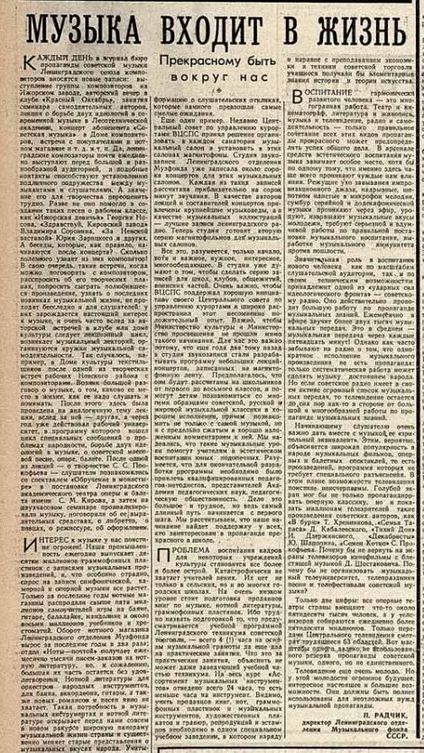 «...Каждый день в журнал бюро пропаганды советской музыки Ленинградского союза композиторов вносятся новые записи: выступление группы композиторов на Ижорском заводе, авторский вечер в клубе «Красный Октябрь», занятия семинара самодеятельных авторов, лекция о борьбе двух идеологий в современной музыке в Лесотехнической академии, концерт абонемента «Советская музыка» в Доме композиторов, встреча с покупателями в нотном магазине и т.д. и т.п.