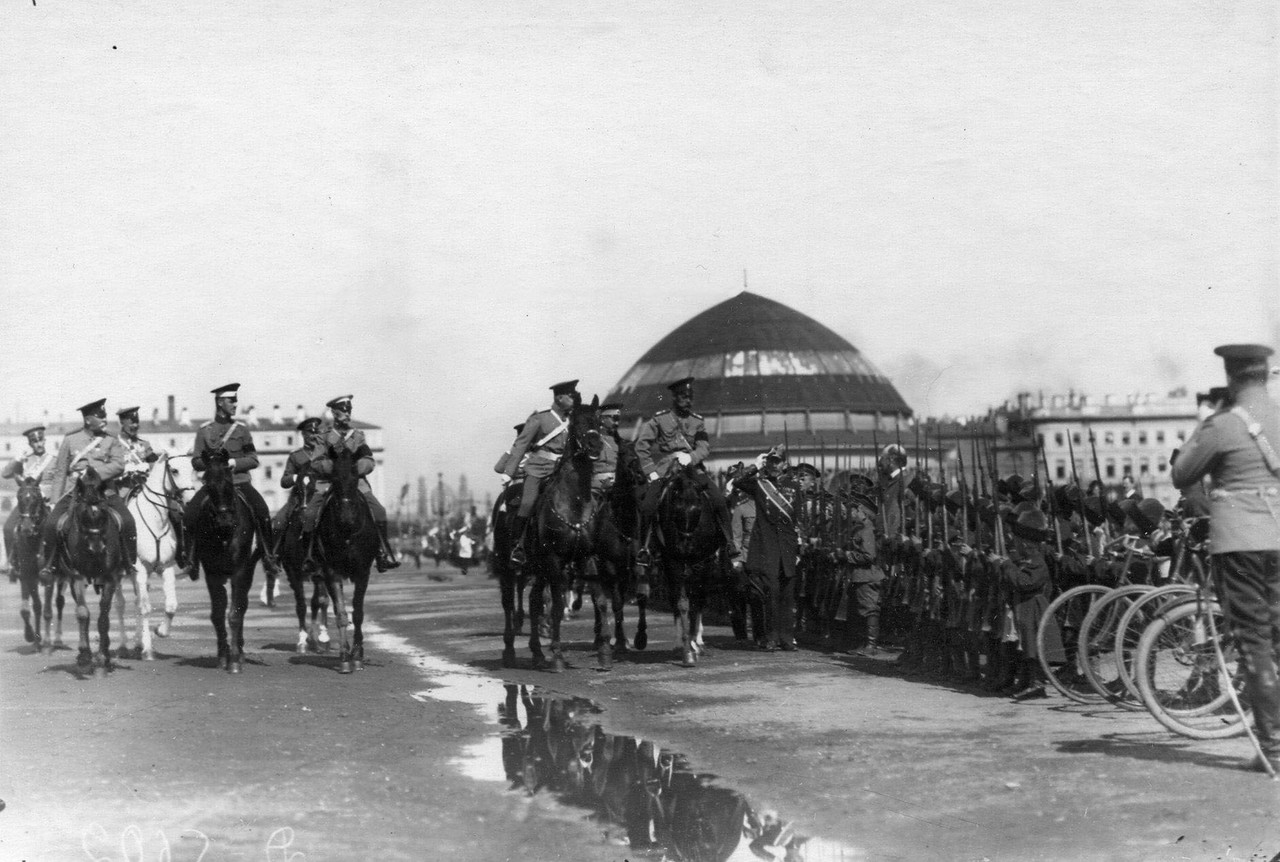 Император Николай II и сопровождающие его лица объезжают войска перед началом парада. 1916. Парад запасных батальонов гвардии на Марсовом поле в Петрограде 19 апреля