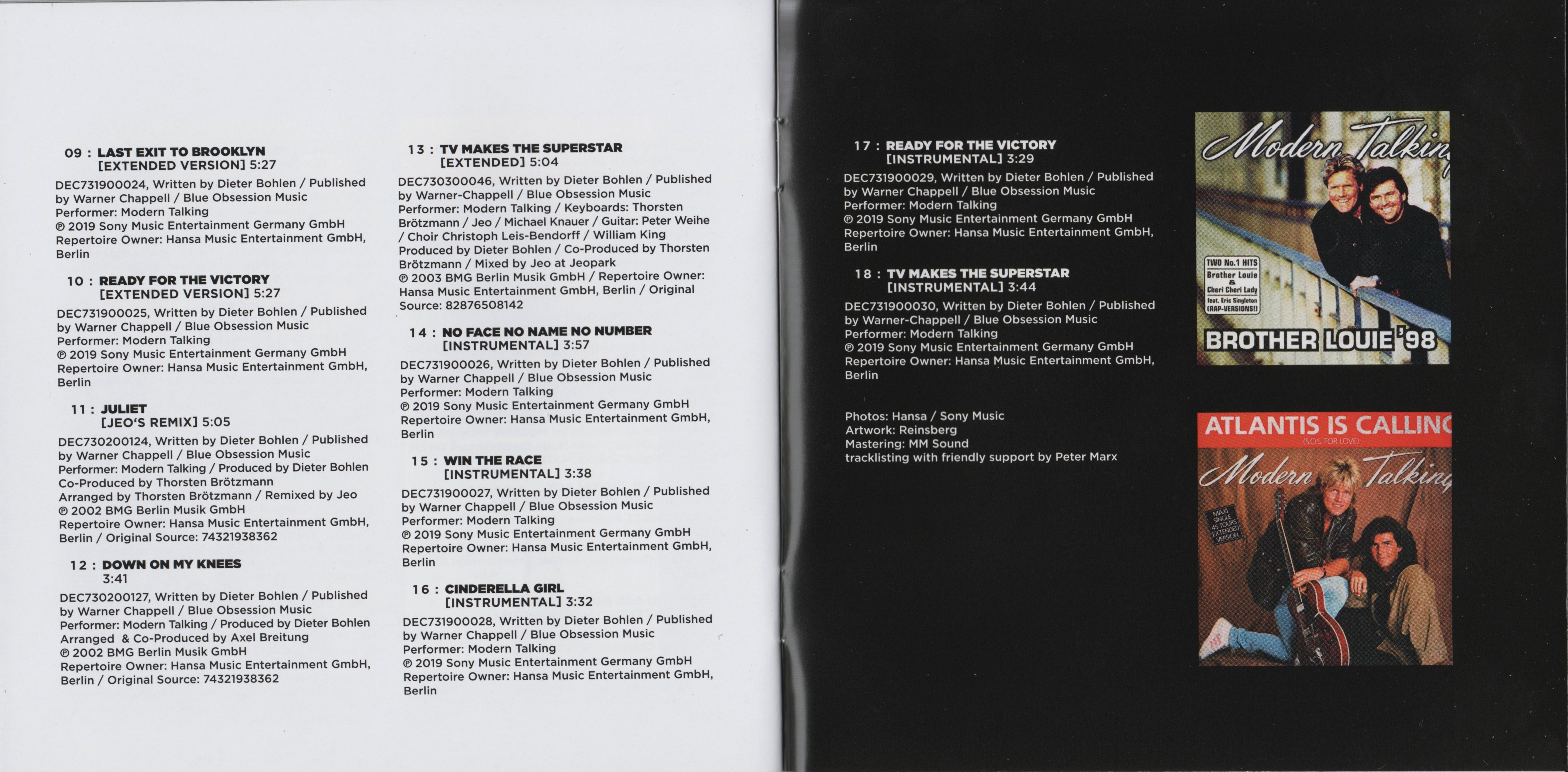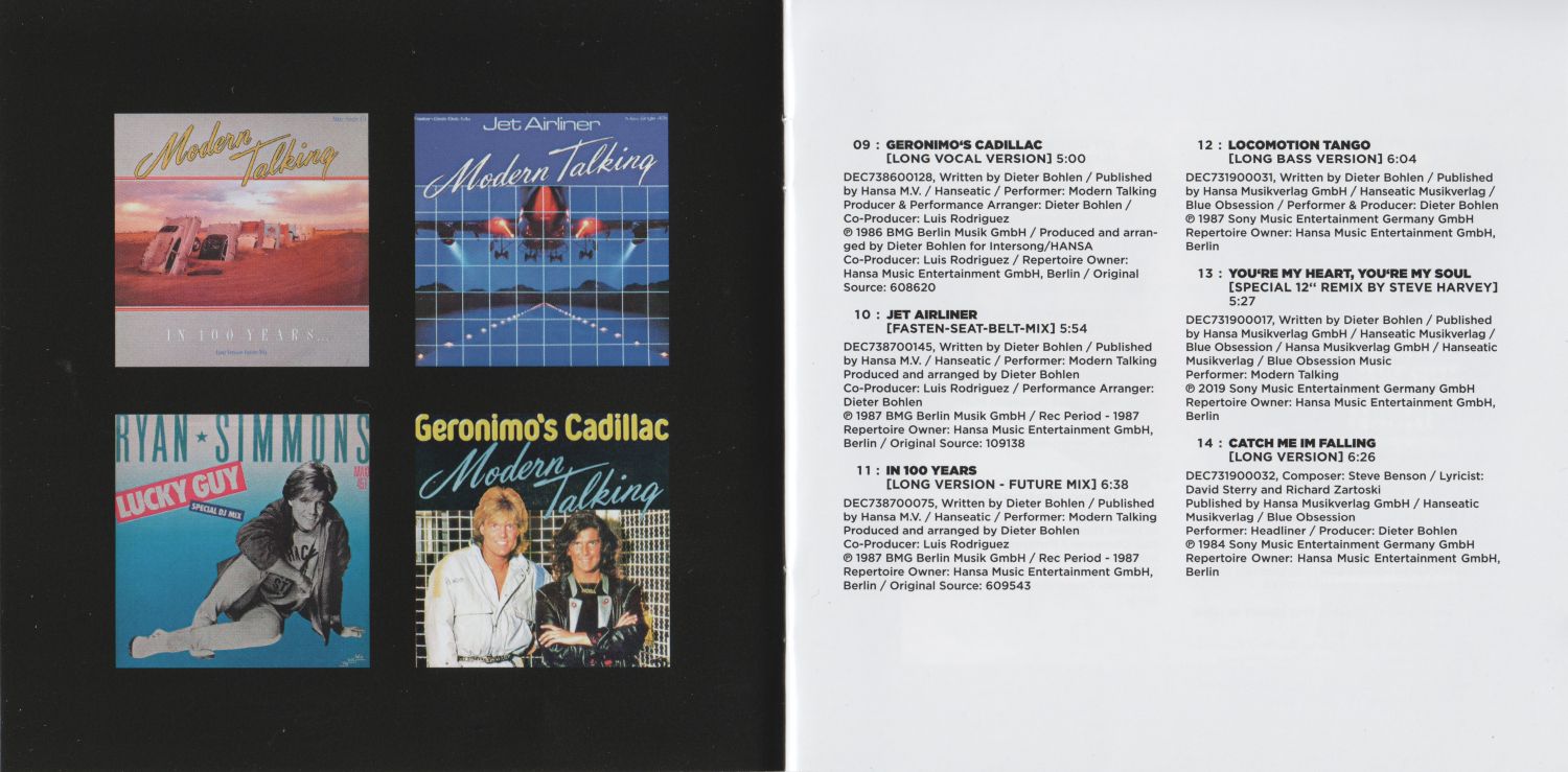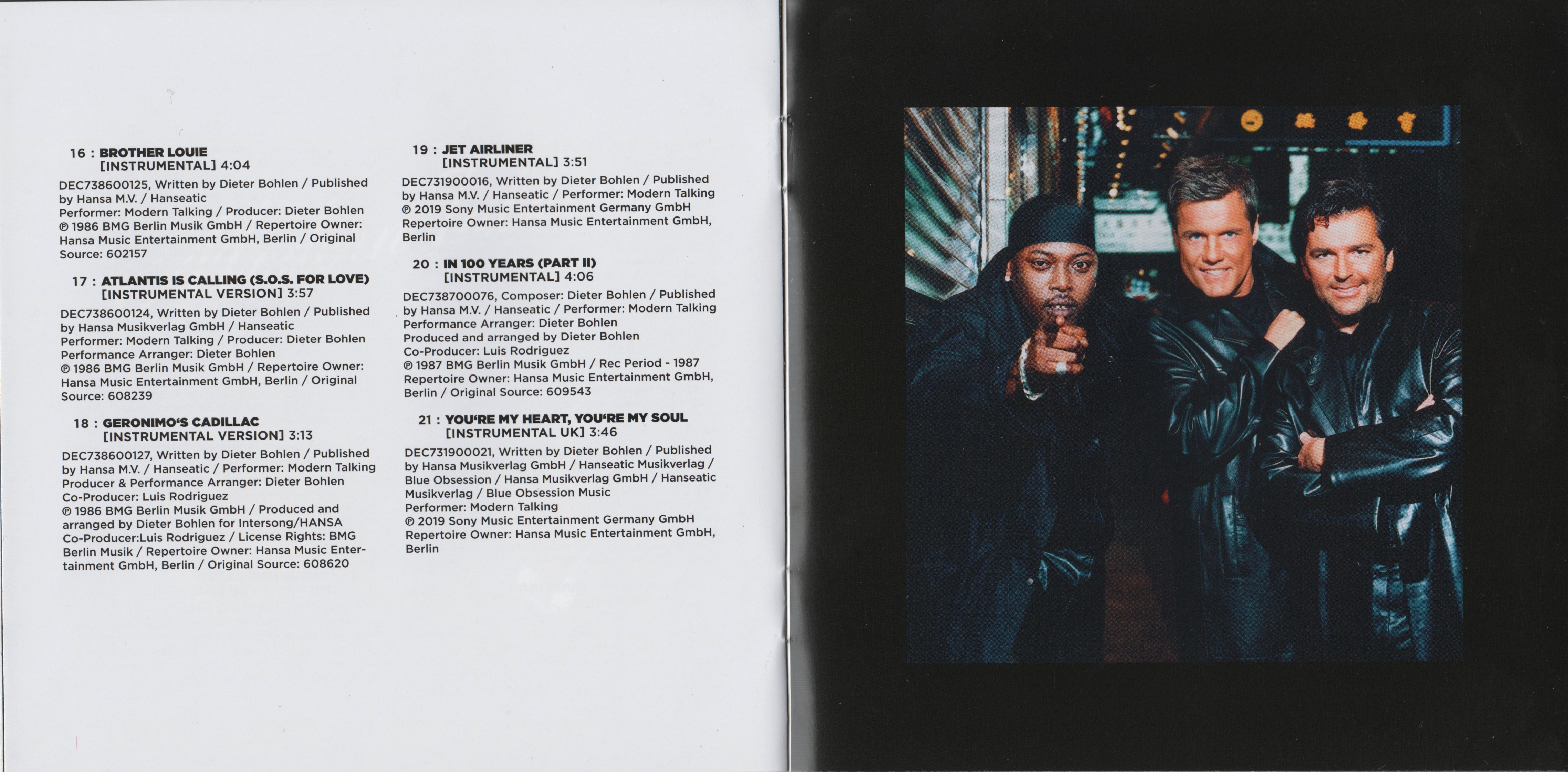 Буклет содержит оригинальные обложки макси-винила, а также великолепные фотографии Дитера и Томаса из старых добрых времён Modern Talking с 1984 по 2003г. Конечно же, есть и актуальный фотоколлаж тура Дитера Болена 2019 года.
