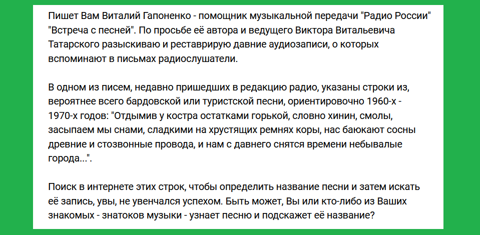 Здравствуйте! Хочу сообщить, что в документальном фильме "Твои ордена, комсомол" 1968 года выпуска в конце первой серии звучит песня в исполнении Владимира Трошина... В фильме есть ещё несколько записей, в конце пятой(за 2-3 минуты до конца) серии звучит та же песня(в сокращённом виде), которую пел Владимир Трошин, в исполнении другого певца...