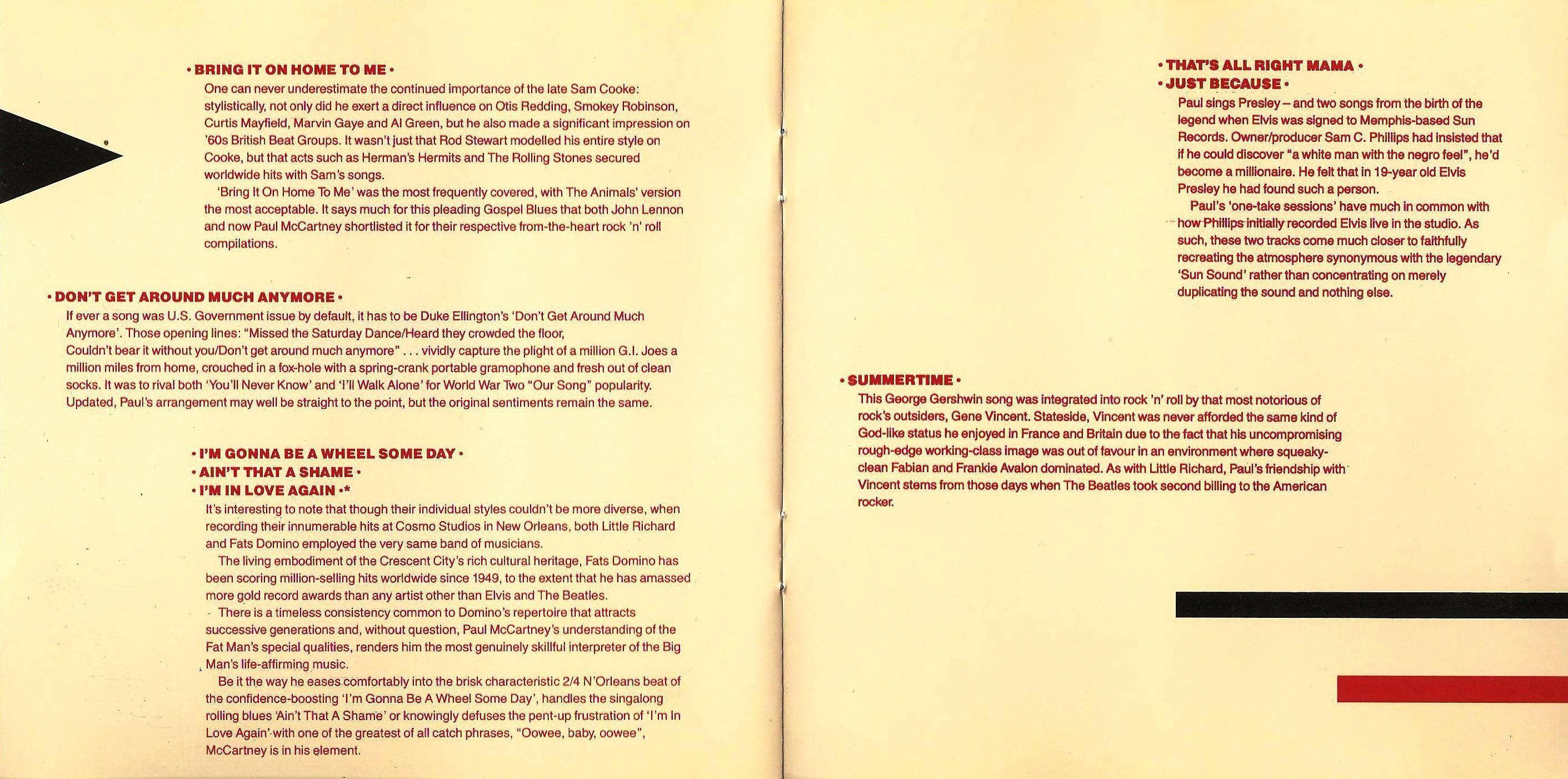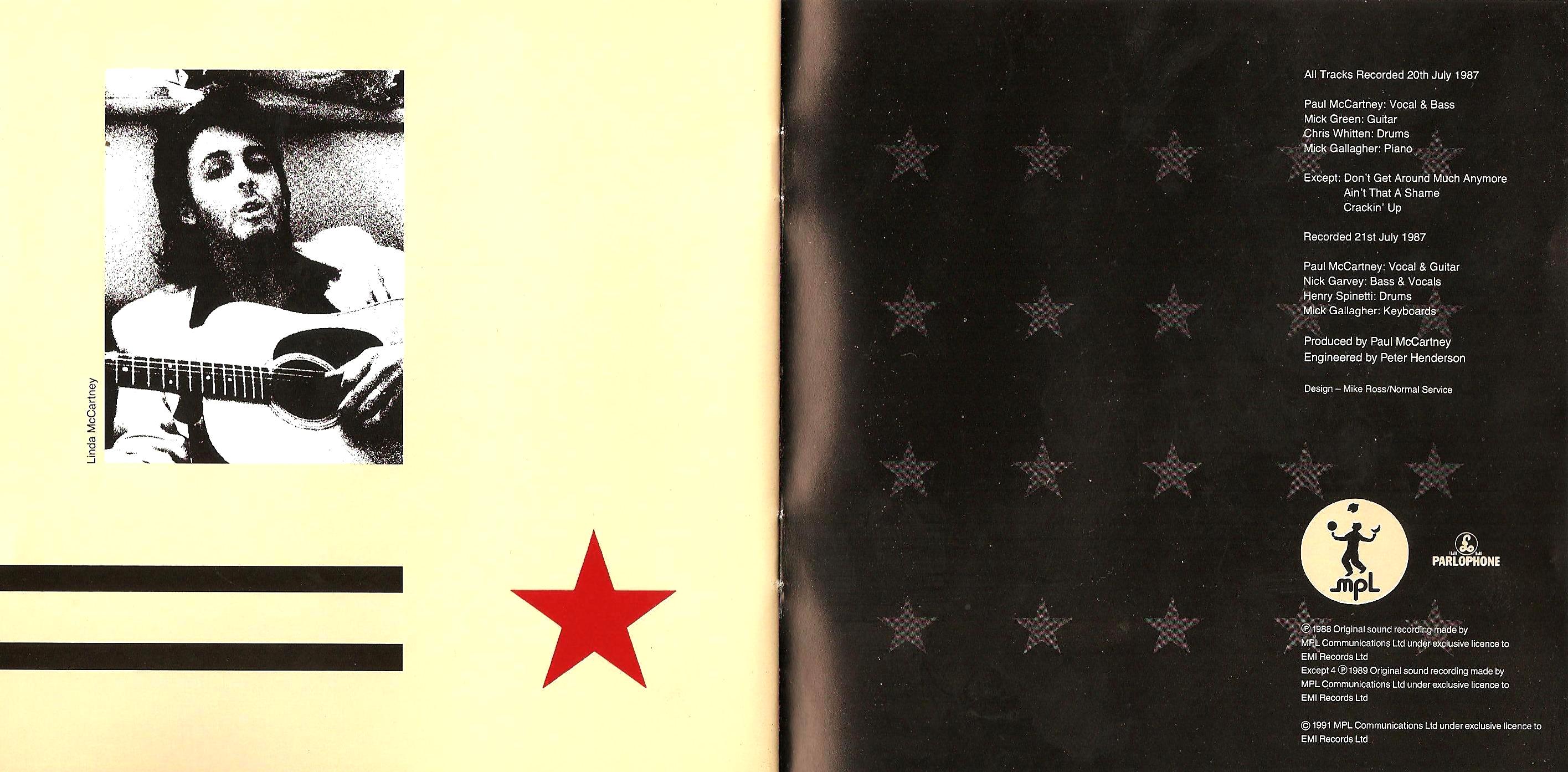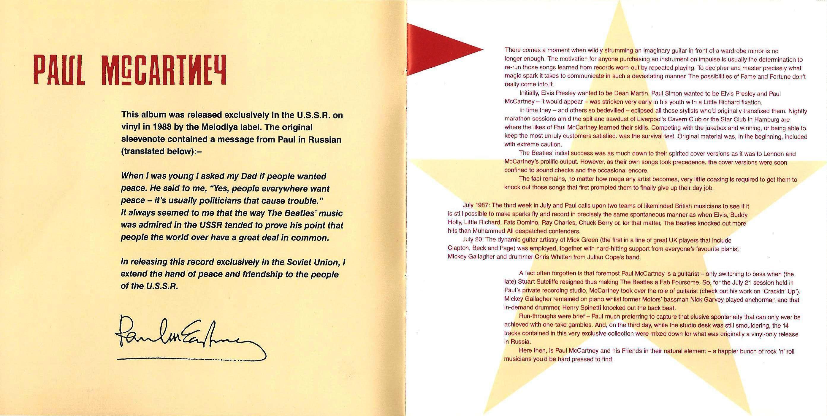 CНОВА B CCCP, российский перевод «Back In The USSR», был выпущен в Советском Союзе в 1988 году, что заставило Пола первым артистом с Запада выпустить альбом исключительно для этого рынка. (Он был выпущен в остальном мире после краха Советского Союза в 1991 году). Размышляя на следующем этапе своей карьеры после прессы 1986 года, чтобы сыграть, Пол решил, что хочет вернуться к своим корням, поэтому нанял трёх сессионных музыкантов и провёл всего два дня, освещая свои любимые хиты 1950-х годов. Сессии записи продюсировали 22 песни, 13 из них заканчивают на финальном альбоме, с одной из песен, оставшейся в обложке «Битлз», я видел, как она стояла там». Для Пола это был глубоко личный альбом и способ признать фанатов, которые поддерживали его и The Beatles с самого начала. «Когда я был очень молод, я спросил своего отца, хотят ли люди мира», - объяснил Пол в то время. «Он сказал мне: «Да, люди повсюду хотят мира - обычно политики доставляют неприятности». Мне всегда казалось, что то, как музыка Битлз восхищалась в СССР, имело тенденцию доказать его точку зрения, что люди во всём мире имеют много общего. Выпустив эту запись исключительно в Советском Союзе, я протягиваю руку мира и дружбы народу России».