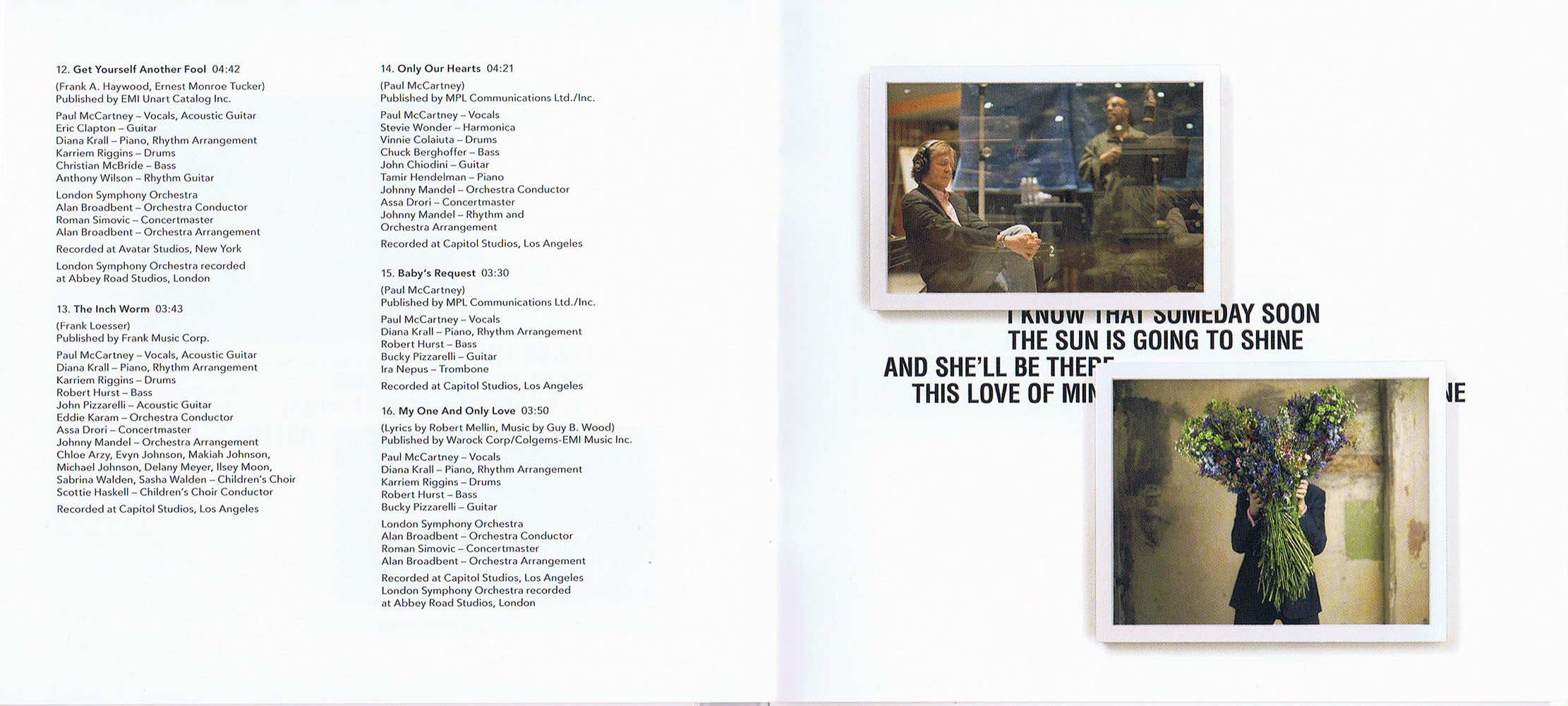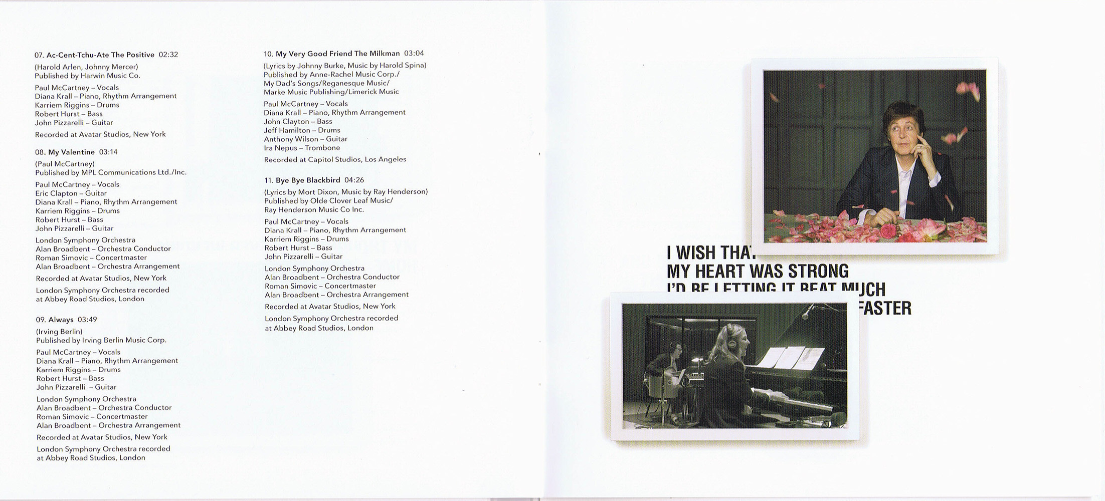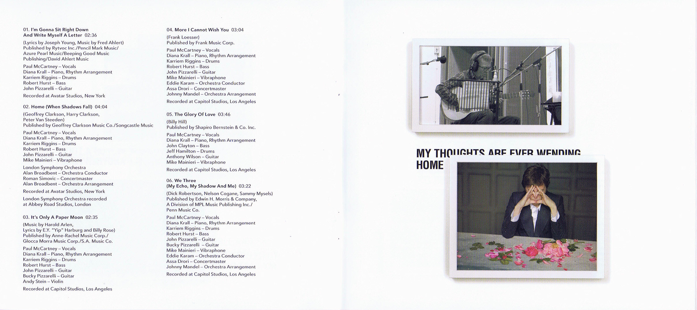Дополнительная информация: Сэр Джеймс Пол Маккартни порадовал своих поклонников новой пластинкой. Шикарный по атмосфере и настроению диск получил название "Kisses On The Bottom" — по строчке из открывающей пластинку композиции "I’m Gonna Sit Right Down And Write Myself A Letter". Альбом появится в продаже 7 февраля 2012 года. Всего на диске будут представлены 14 композиций. В подарочное издание (то самое, что вы сейчас имеете честь лицезреть) вошли парочка бонусов — "Baby’s Request" и "My One And Only Love".