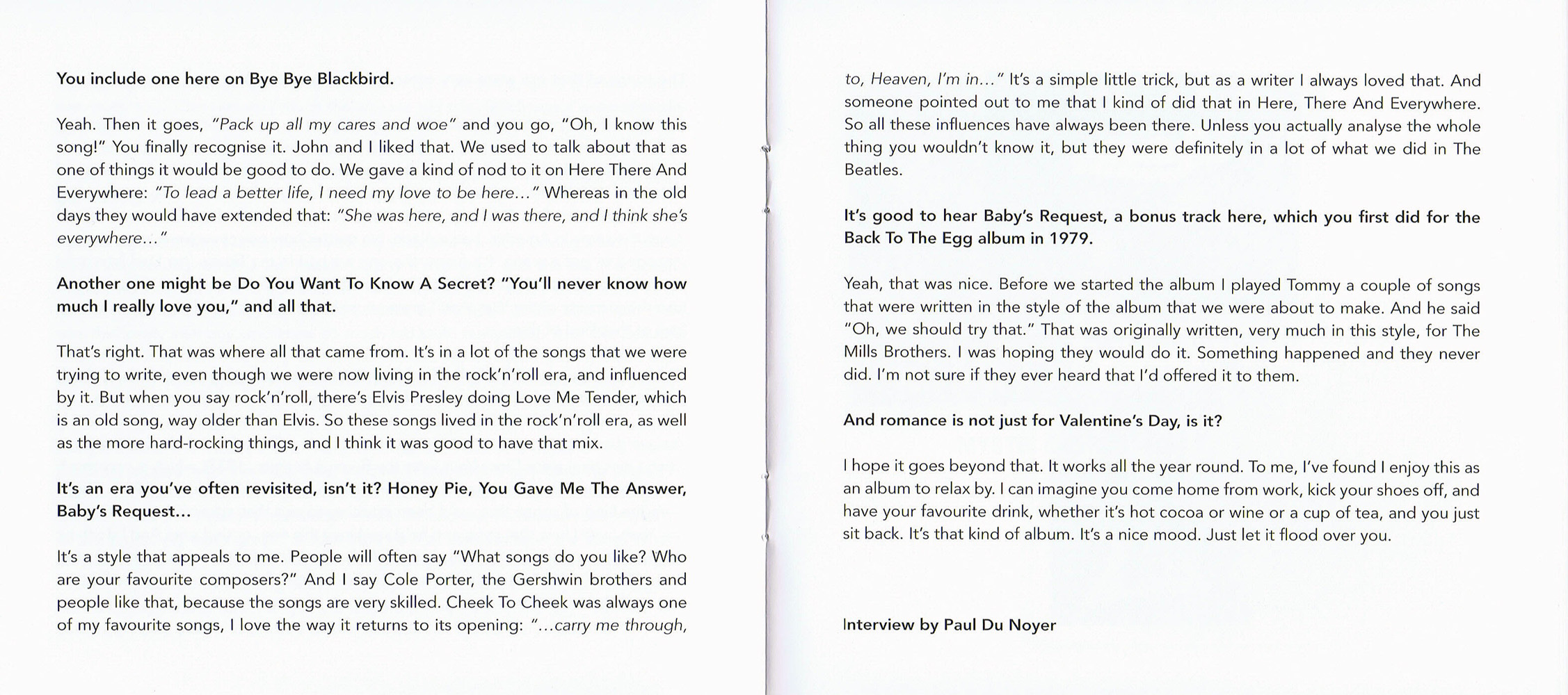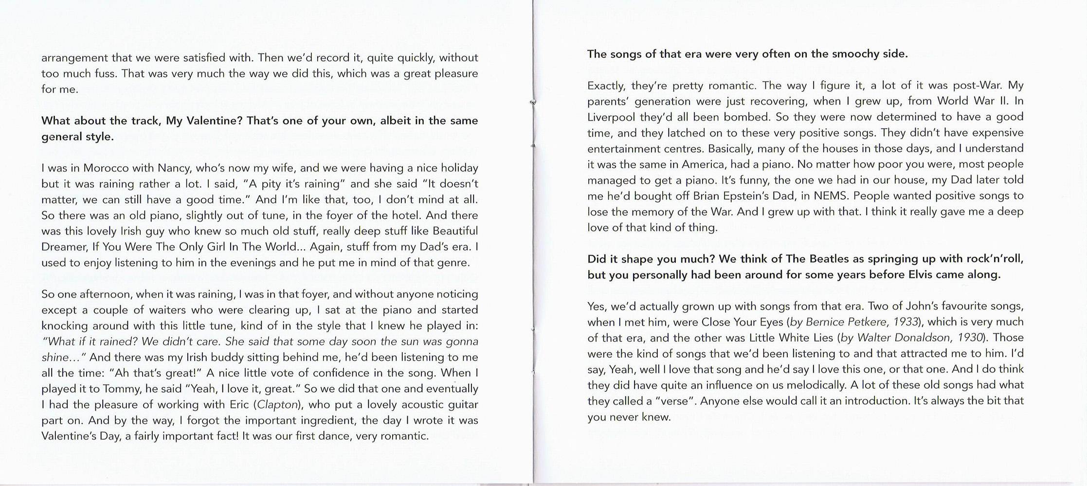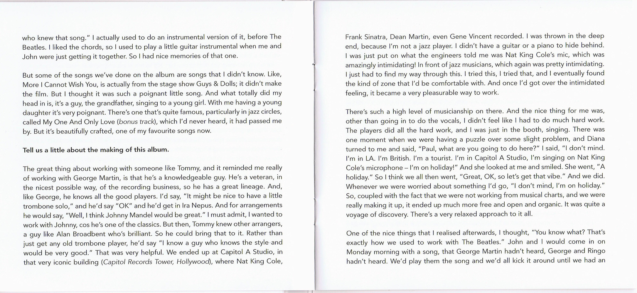 Дополнительная информация: Сэр Джеймс Пол Маккартни порадовал своих поклонников новой пластинкой. Шикарный по атмосфере и настроению диск получил название "Kisses On The Bottom" — по строчке из открывающей пластинку композиции "I’m Gonna Sit Right Down And Write Myself A Letter". Альбом появится в продаже 7 февраля 2012 года. Всего на диске будут представлены 14 композиций. В подарочное издание (то самое, что вы сейчас имеете честь лицезреть) вошли парочка бонусов — "Baby’s Request" и "My One And Only Love".