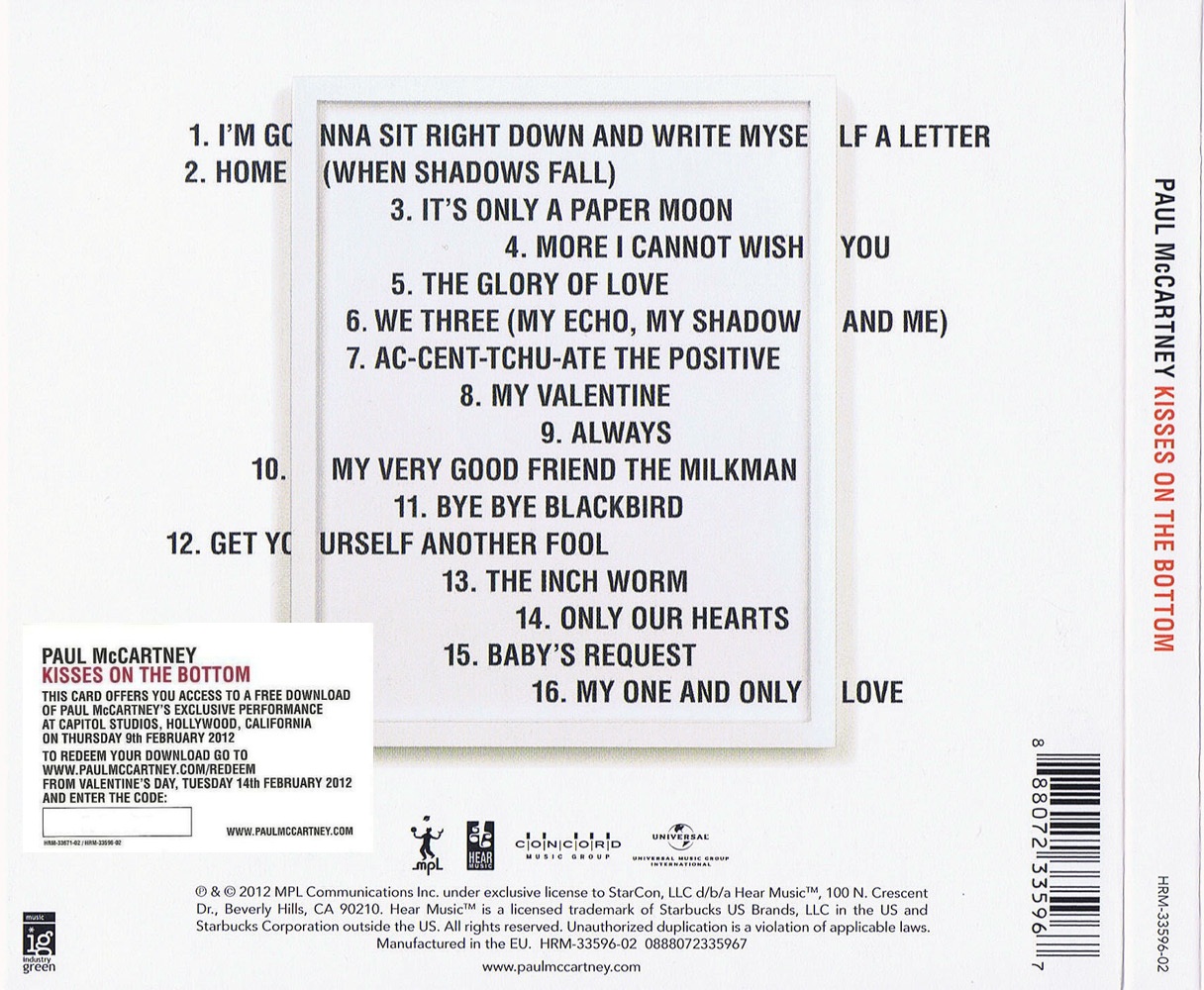 Kisses on the Bottom («Поцелуи в конце письма») — пятнадцатый студийный альбом в сольной карьере Пола Маккартни. Альбом выпущен 03 февраля 2012 года лейблом Hear Music на CD-носителях и виниловых пластинках. Данный вариант CD выпущен 12 февраля 2012 года.