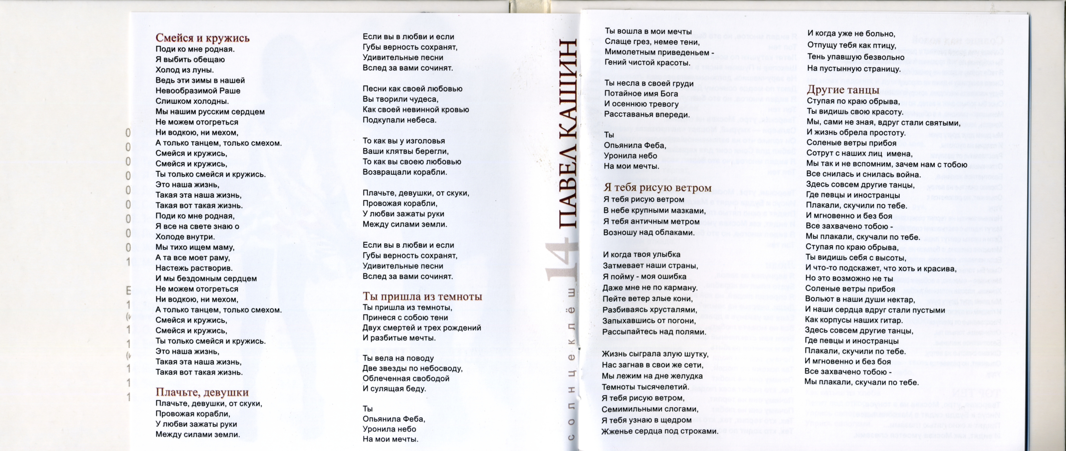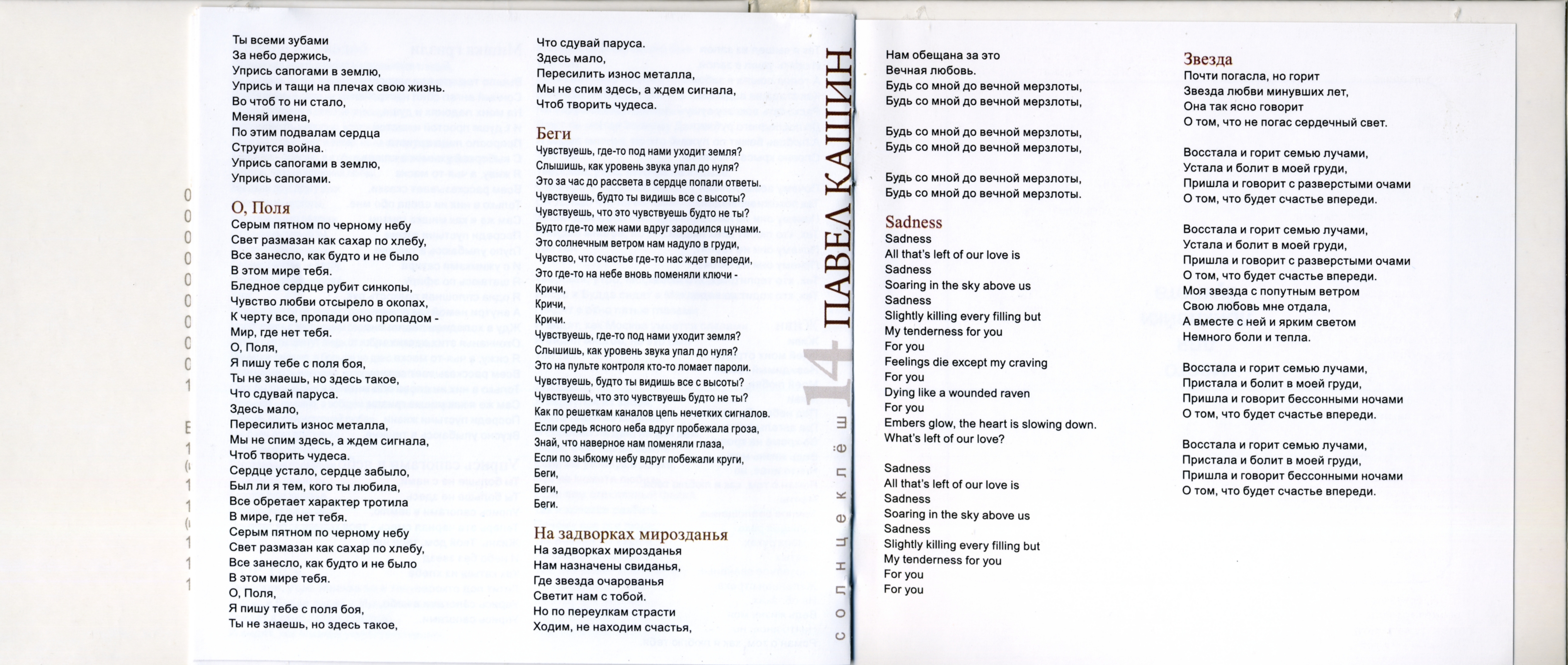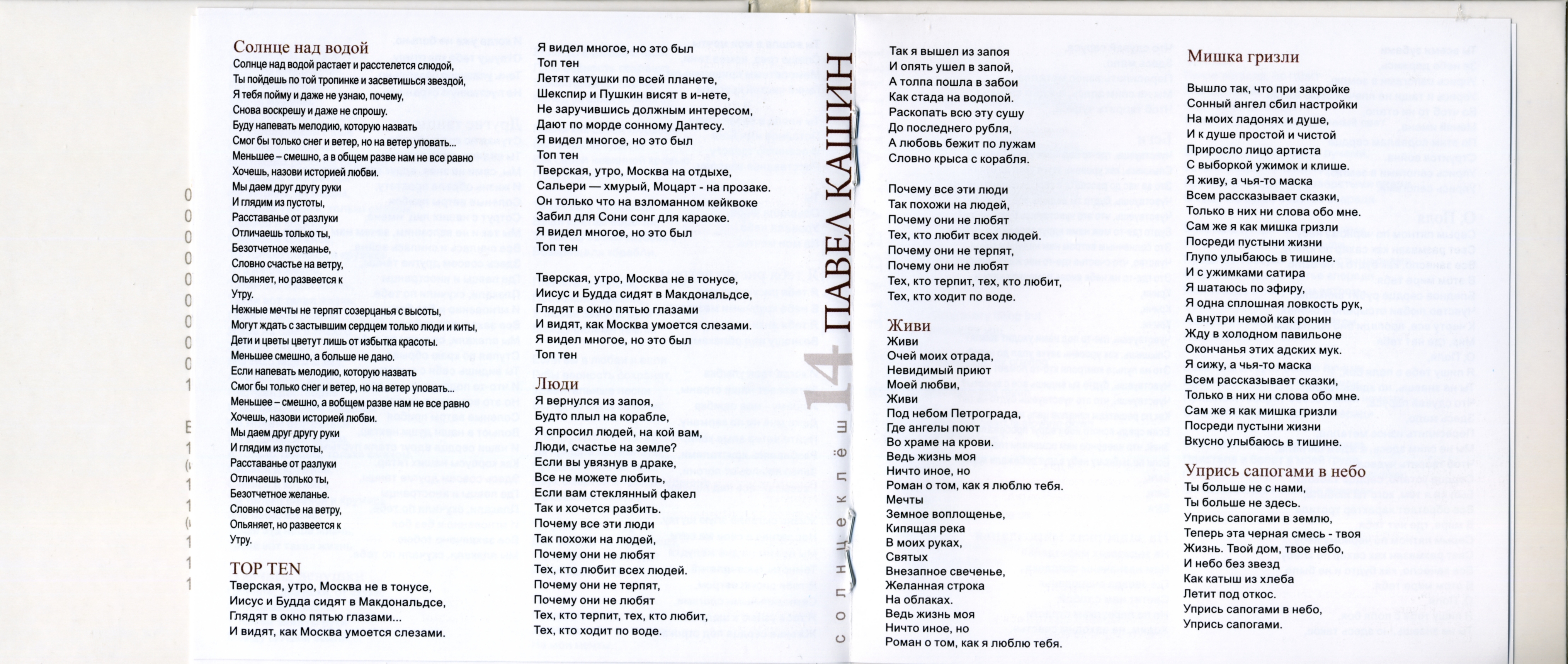 Буклет, кстати, содержит тексты всех звучащих на диске композиций (и даже двух не звучащих), что даже при беглом изучении вызывает желание переслушать некоторые песни. Наряду с романтишными словесами, которые на имидже Кашина сидят как влитые ("ты пришла из темноты, принеся с собою тени двух смертей и трёх рождений и разбитые мечты"), в стихах попадаются довольно брутальные парадоксы — и они, как ни удивительно, тоже исполнителю очень идут. "Тверская, утро, Москва не в тонусе, Иисус и Будда сидят в Макдональдсе, глядят в окно пятью глазами… И видят, как Москва умоется слезами"; "А любовь бежит по лужам, словно крыса с корабля". А вот, пожалуй, самая важная цитата: "Вышло так, что при закройке сонный ангел сбил настройки на моих ладонях и душе, и к душе простой и чистой приросло лицо артиста с выборкой ужимок и клише. Я живу, а чья-то маска всем рассказывает сказки, только в них ни слова обо мне". И кто бы ждал такой самоиронии и здравомыслия от певца, давно проходящего по ведомству "не от мира сего"?