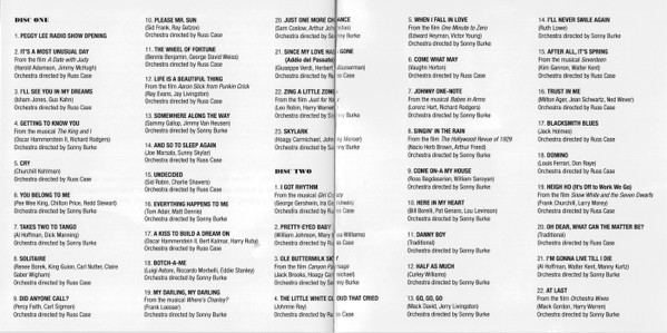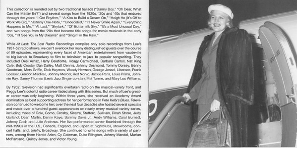 The 2015 two-disc Peggy Lee anthology At Last: The Lost Radio Recordings compiles live performances the iconic vocalist gave for her radio show in 1951. Originally broadcast over the CBS network and the Armed Forces Radio Service, these performances showcase Lee backed by bands led by Sonny Burke in Los Angeles and Russ Case in New York. Rather than focusing on her best-known material, Real Gone instead has handpicked songs Lee never officially recorded in a studio, including many songs made famous by her contemporaries like Doris Day, Rosemary Clooney, Dinah Shore, and Jo Stafford. Included are such songs as "I'll See You in My Dreams," "The Wheel of Fortune," "Everything Happens to Me," "Ole Buttermilk Sky," "I'll Never Smile Again," and many more.